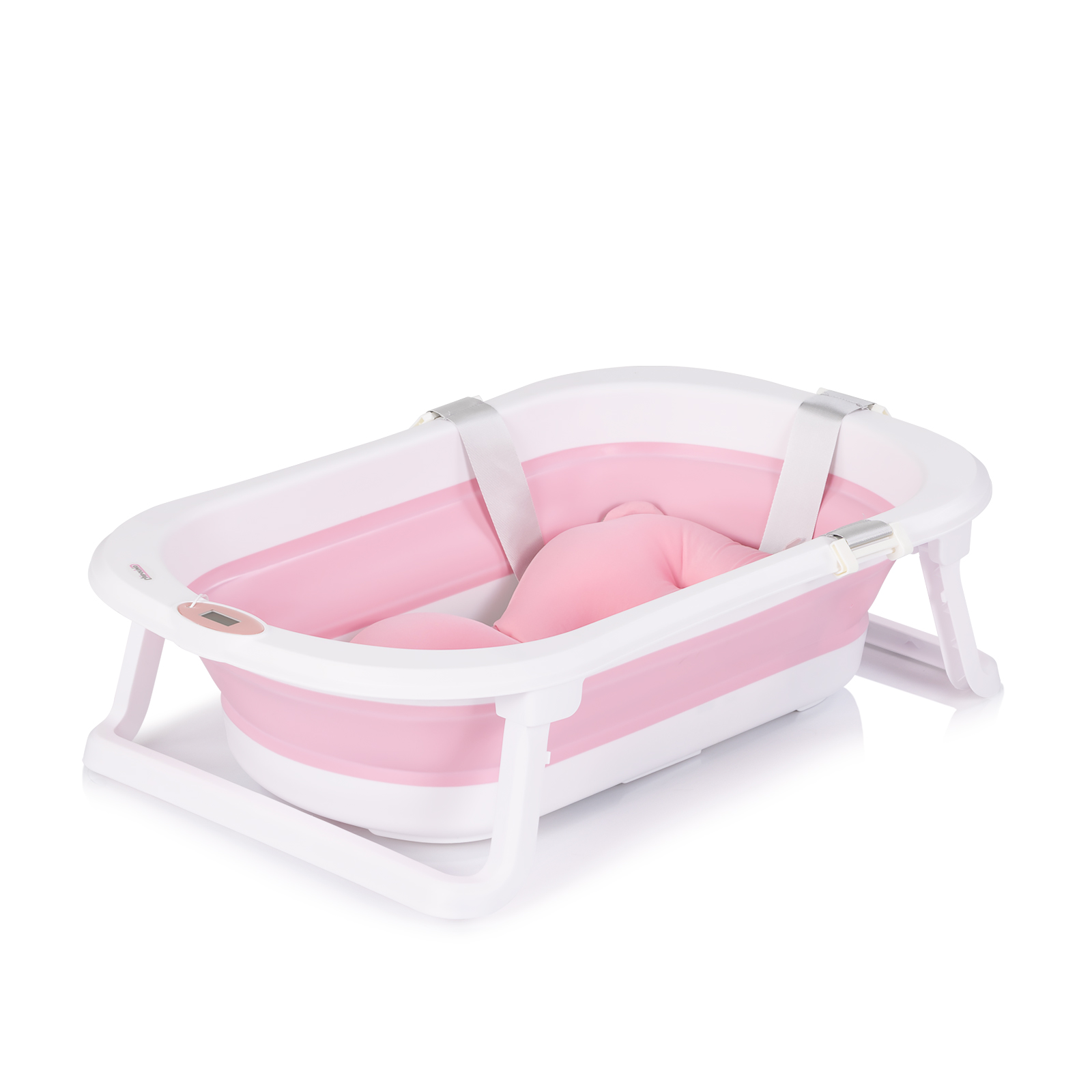 - Сгъваема метална стойка – повдига ваната на удобна височина, предпазвайки гърба на родителите.