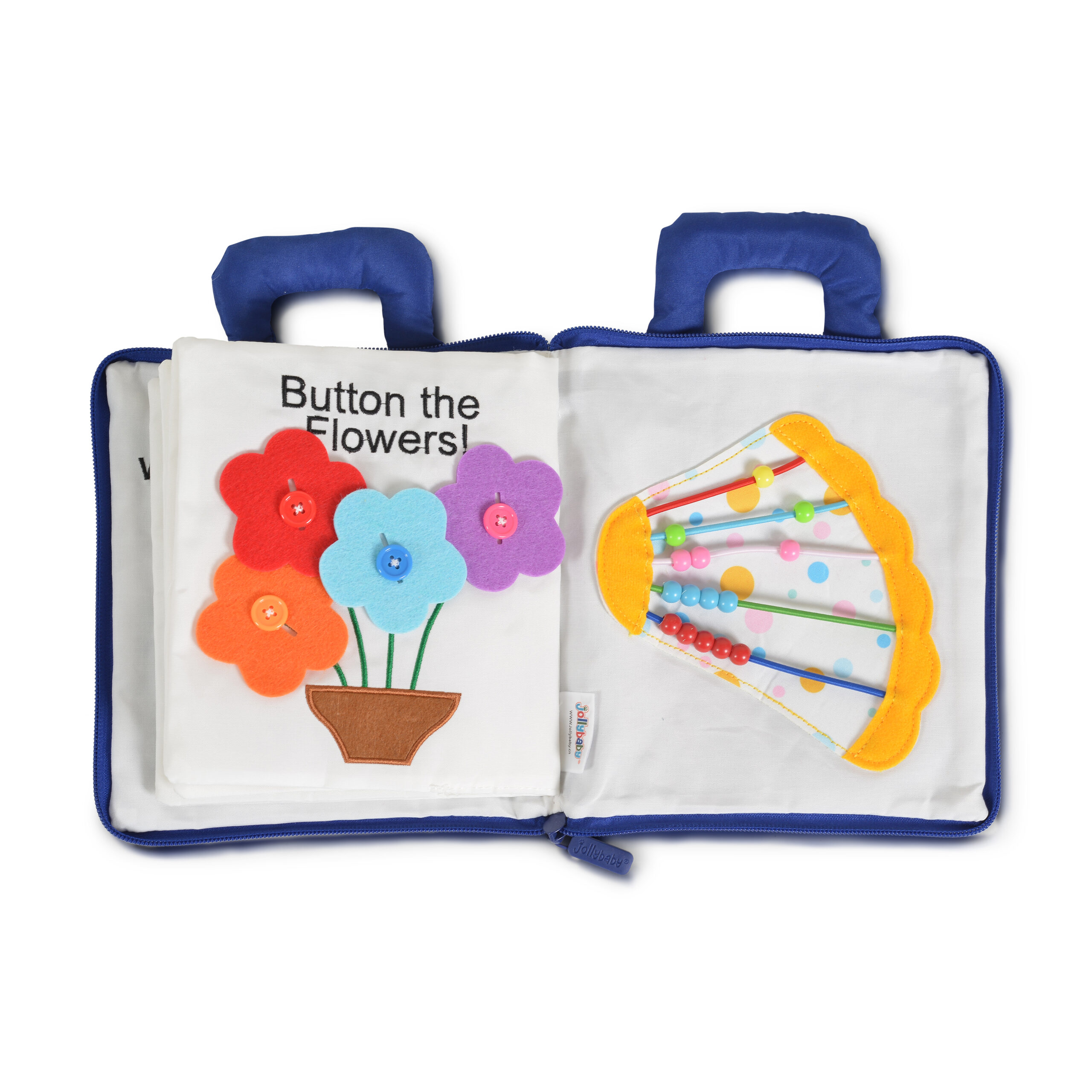 Съдържа интересни елементи като връзки за обувки, меки стрелки на часовник, велкро фигурки, копчета и др.