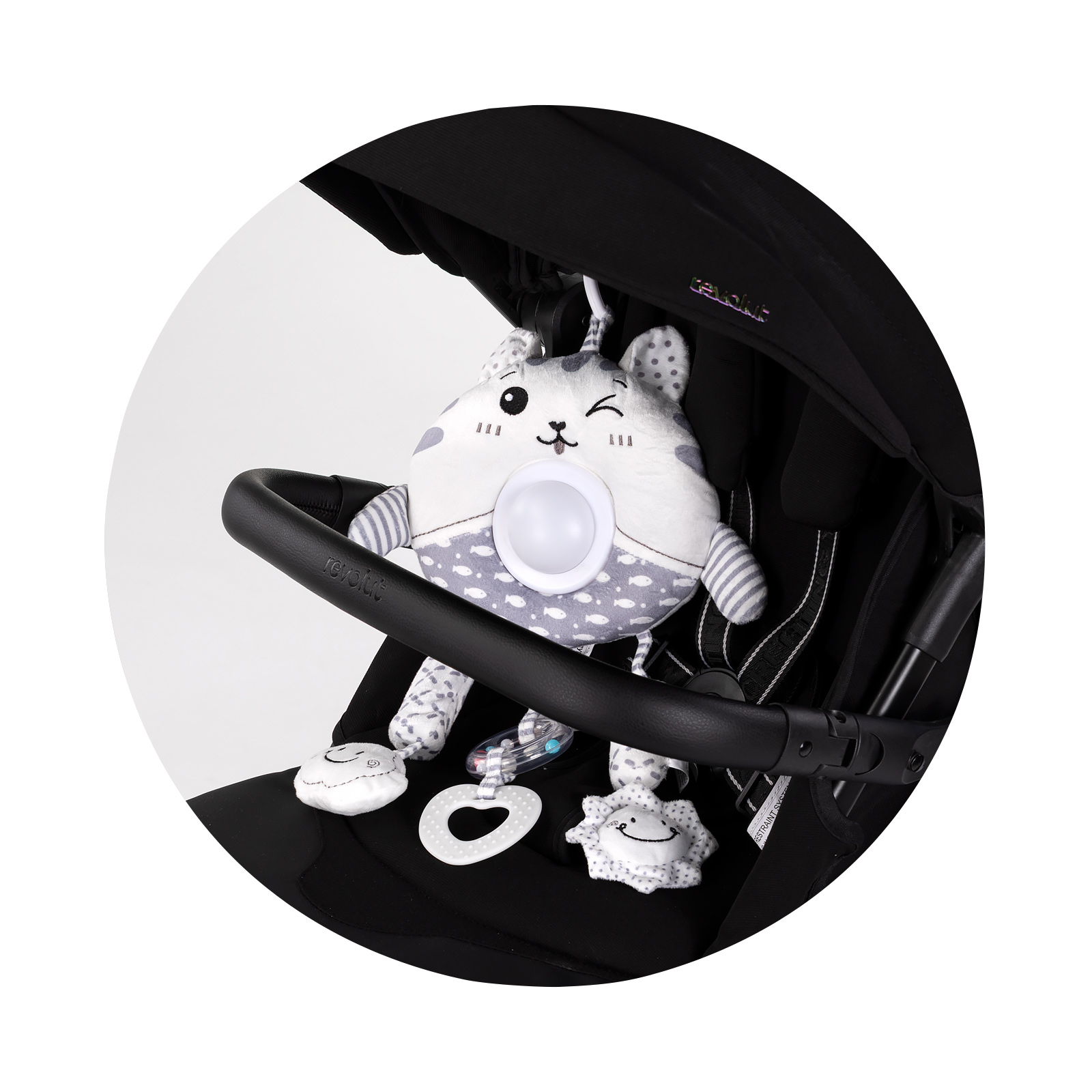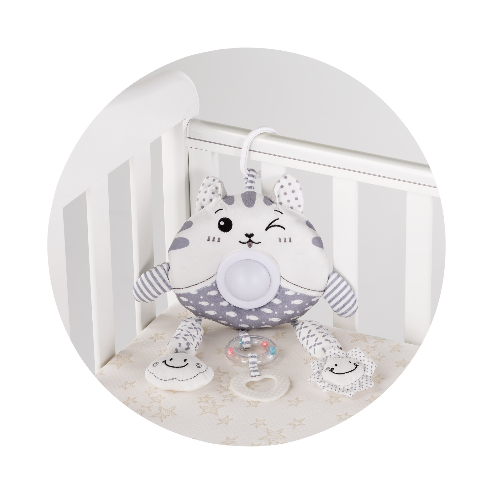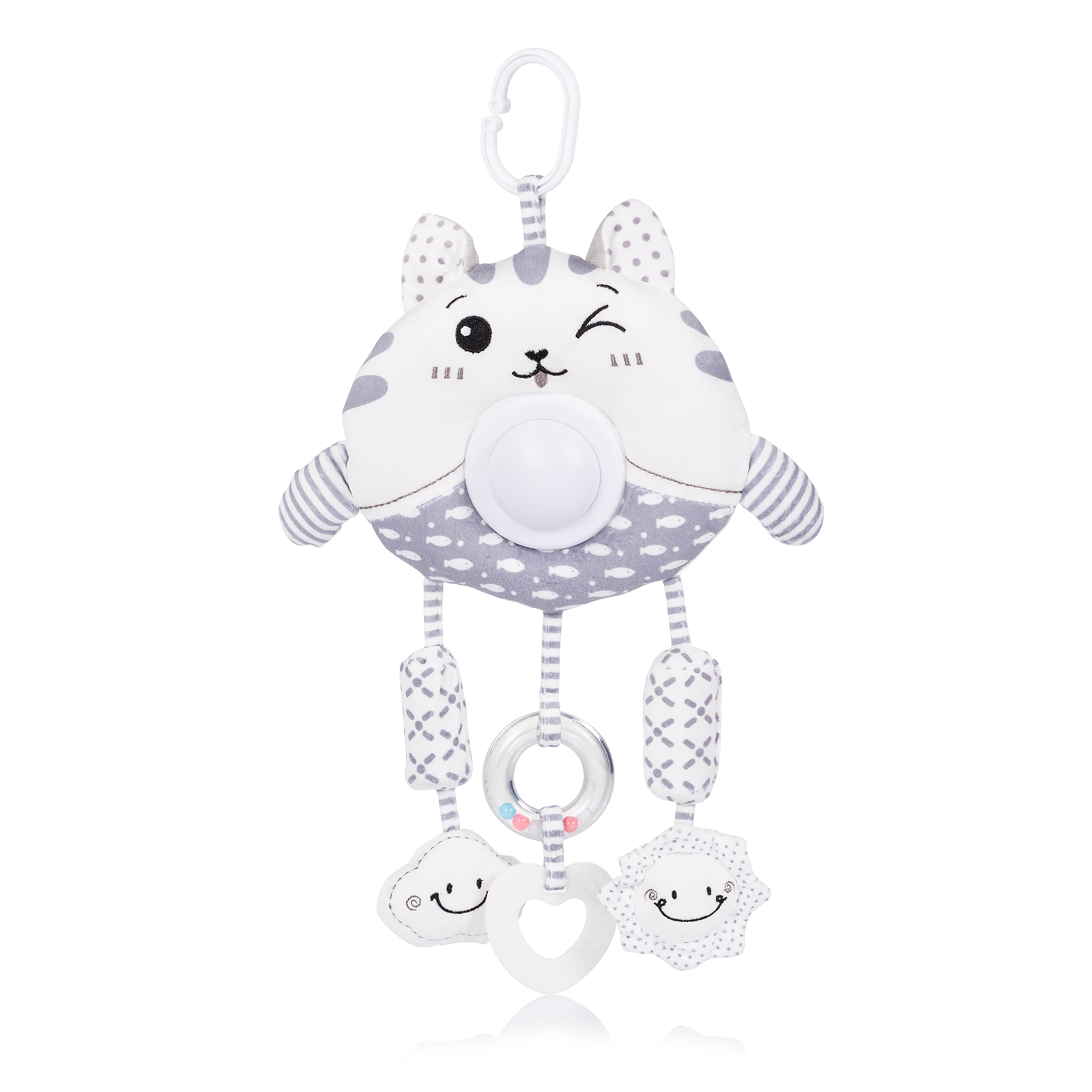 Очарователна и практична плюшена играчка, която може да се прикрепя както към бебешка количка, така и към леглото. Тя съчетава мек и безопасен плюш с вградена музикална кутия и светлинни ефекти, за да осигури спокойствие и забавление на вашето мъниче. Играчката разполага с 15 различни мелодии и песни, които се сменят лесно с едно натискане на бутон.