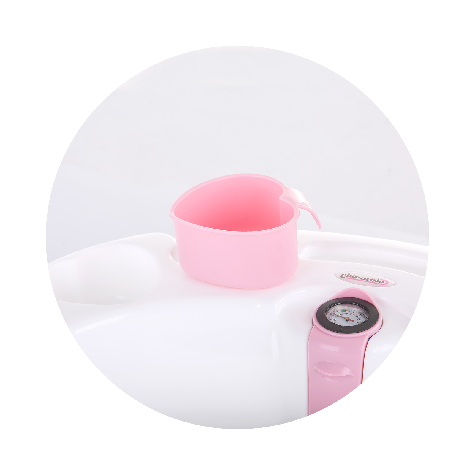 • Ваната е оборудвана с вграден термометър за вода, който автоматично показва температурните промени, за да може родителят да прецени дали водата не е твърде топла или студена за бебето;