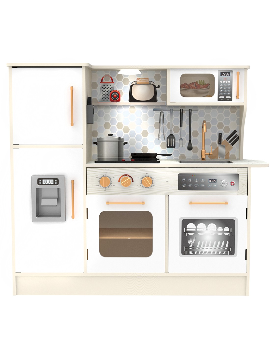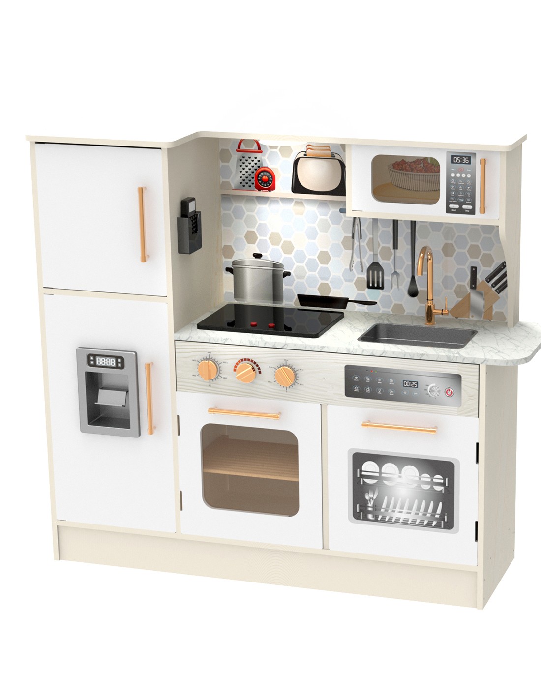 Създадена по прототип на истинска такава, тази стилна кухня ще превърне мигновено дечицата в същински шеф готвачи. Тя се състои от 12 части, изработени от висококачествен дървен материал, и е оборудвана с микровълнова печка, съдомиялна машина, фурна, електрическа плоча, имитираща котлон със светлинни и звукови ефекти, хладилник с машина за правене на лед, мивка и допълнително осветление. Всички тези елементи гарантират пълно готварско изживяване и незабравими спомени за цялото семейство.