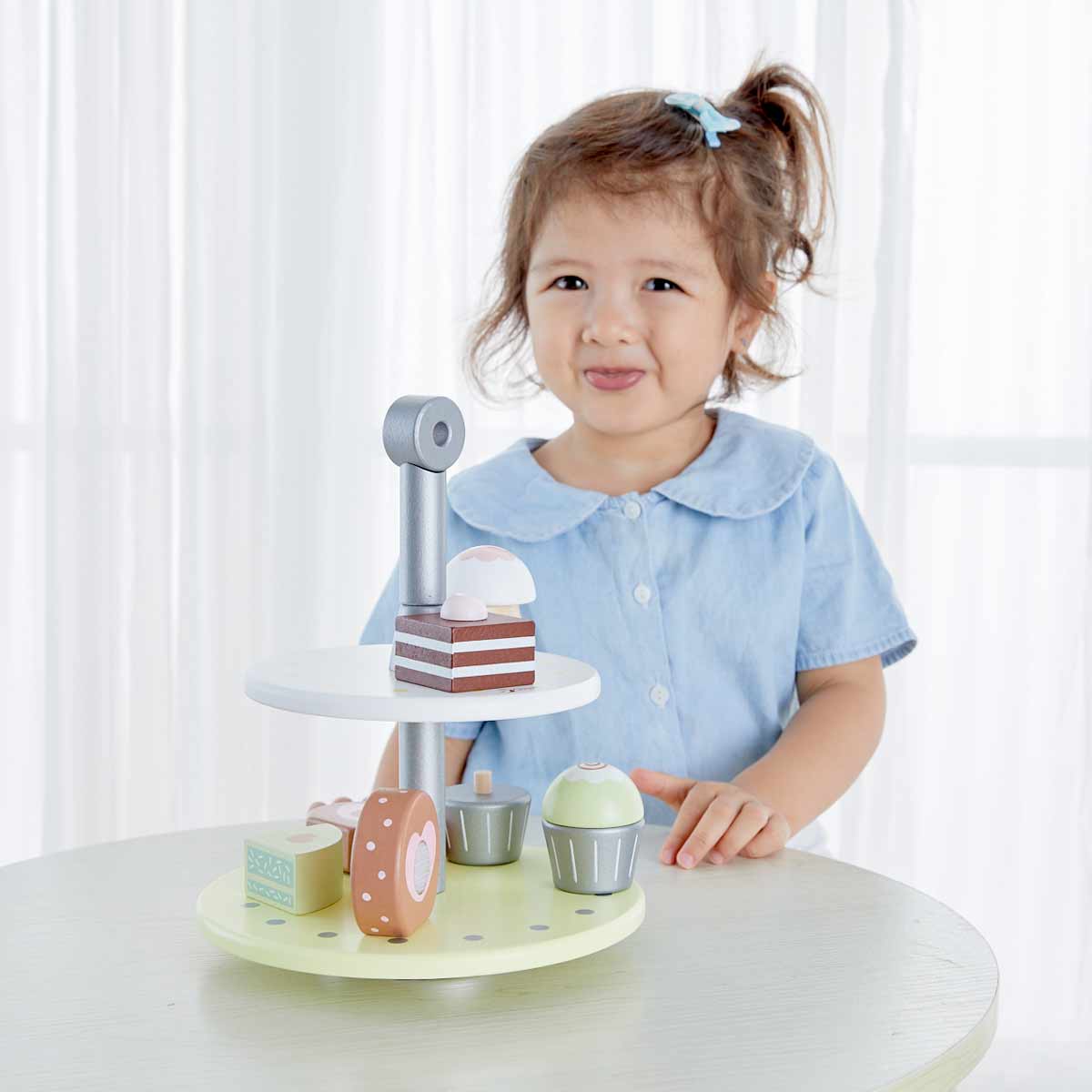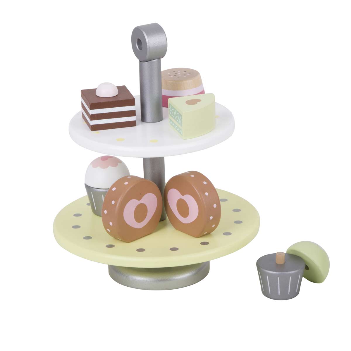 Цветно и интересно забавление за вашите малки момичета и момчета, които искат да приготвят своите сладки изкушения за любимите хора – мама и тати. Нашата красива поставка за сладкиши включва 6 дървени кексчета и лакомства с взаимозаменяеми върхове и дъна.