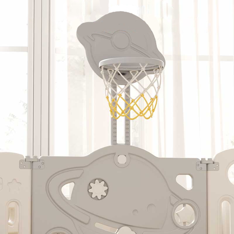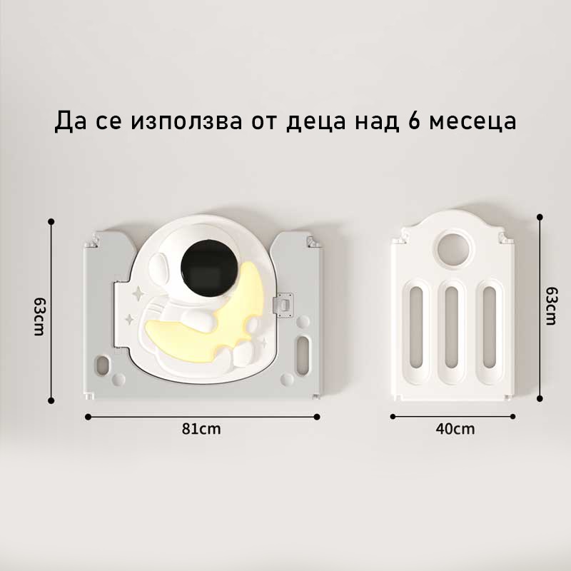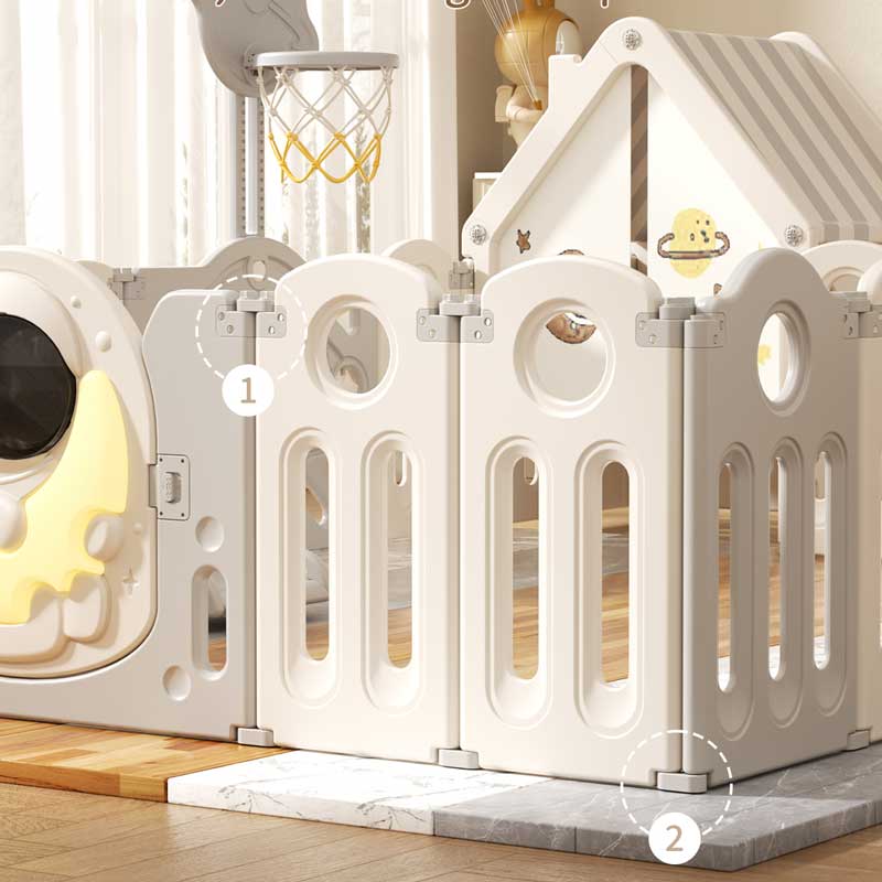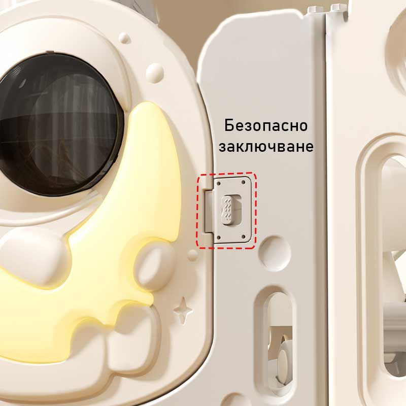Детската къщичка с ограда и баскетболен кош, със специален елемент – космонавт, е функционален и забавен детски кът за малчуганите. С включени занимания като стена с активности, баскетболен кош и къщичка, те ще играят на воля. Моделът е лек, компактен и изключително безопасен. С него ще подарите усмивки на децата и почивка за себе си!