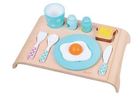 Невероятен детски комплект със закуска на Classic World в свежи, сини цветове. Комплектът е изработен от дърво и е боядисан с бои на водни основа. Той съдържа всичко необходимо за една хубава закуска – пържено яйце в чинийка, чашка за кафе или чай, печена филийка и още много други. Страхотно допълнение към всяка детска кухня! Комплектът е оборудван с: табла, солничка, пеперничка, нож, вилица, лъжица, чаша, чинийка, филийка хляб и пържено яйце.