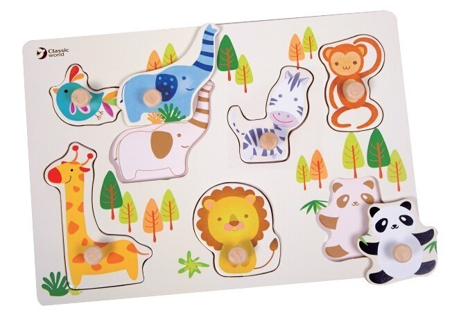 В пъзела ще намерите 7 дървени елемента с образа на различни животни – слон, зебра, майнума, панда, жираф, лъв и птичка. Те се различават както по големина, така и по форма. Краищата на животинките са заоблени, като по този начин се избягва рискът от нараняване. Всяка дървена фигурка е снабдена с малка дръжка, която улеснява захващането от малките детски ръчички. Частите на пъзела са изработени от дърво и са оцветени с безвредни бои на водна основа.