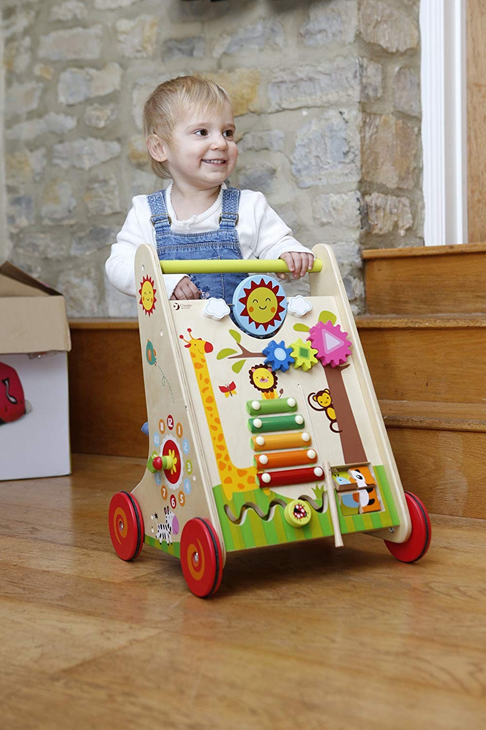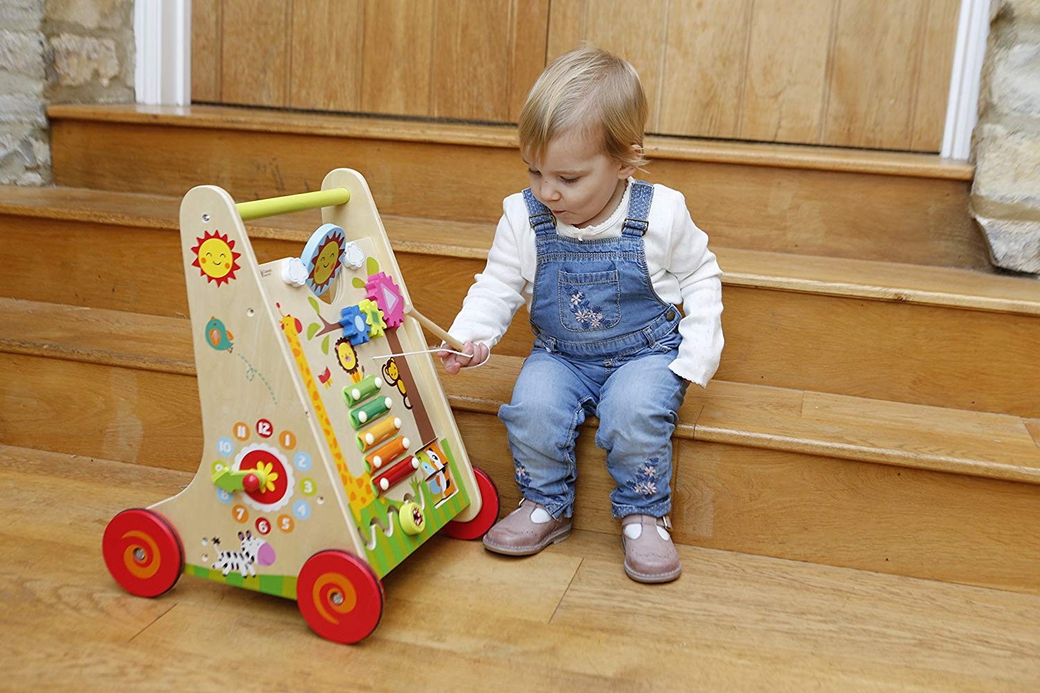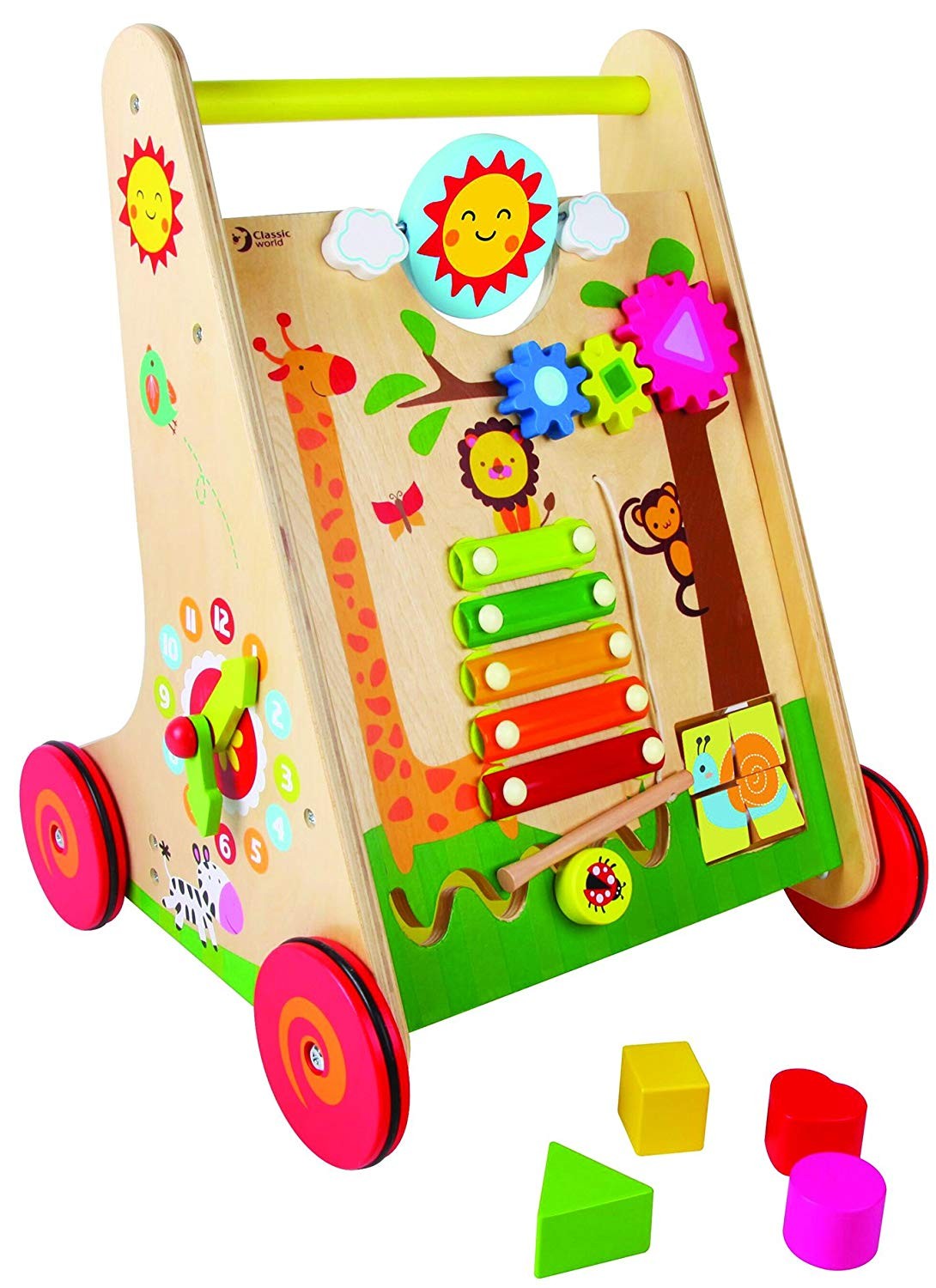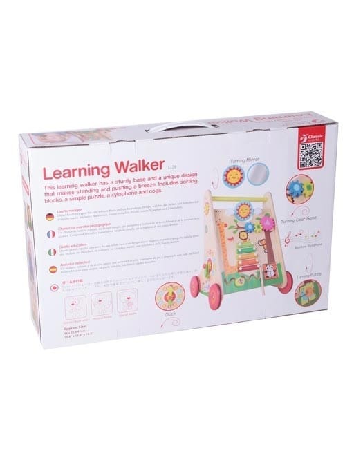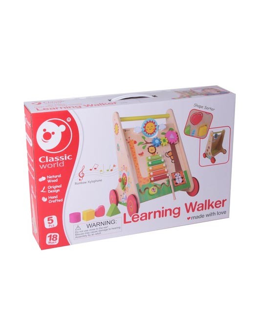 Детски дървен Уокър проходилка с игри Classic World е най-добрият помощник в първите стъпки на едно дете. Проходилката дава възможност за интересни игри, като тези с ксилофон и 3D формички за сортиране. Също така има и огледало, зъбни колела и специално отделение за играчки. За да се осигури лесно бутане, колелата са гумирани. Материалите и изработката са от най-високо качество.