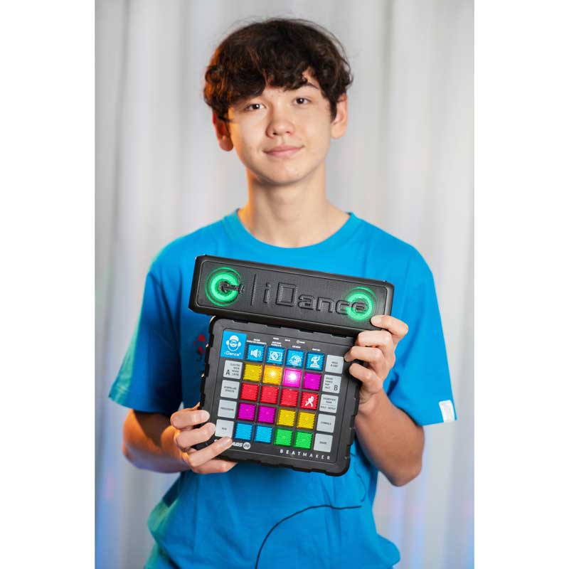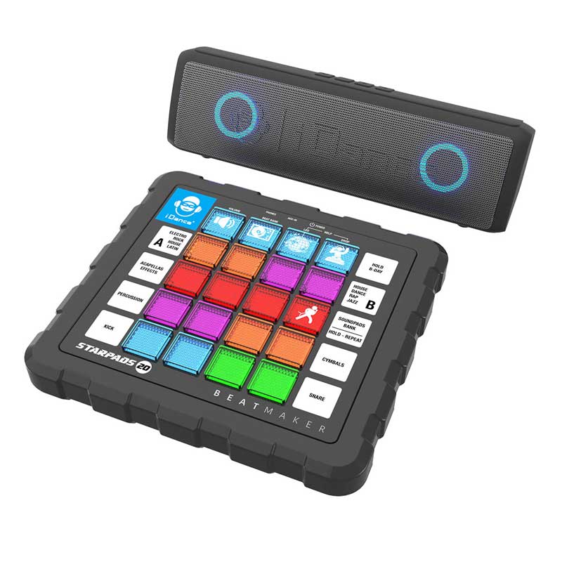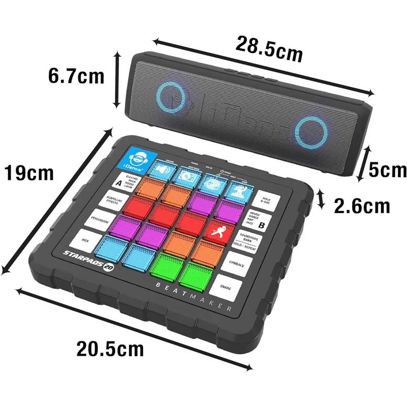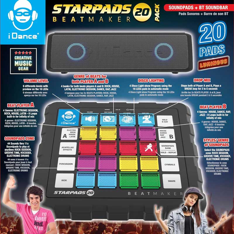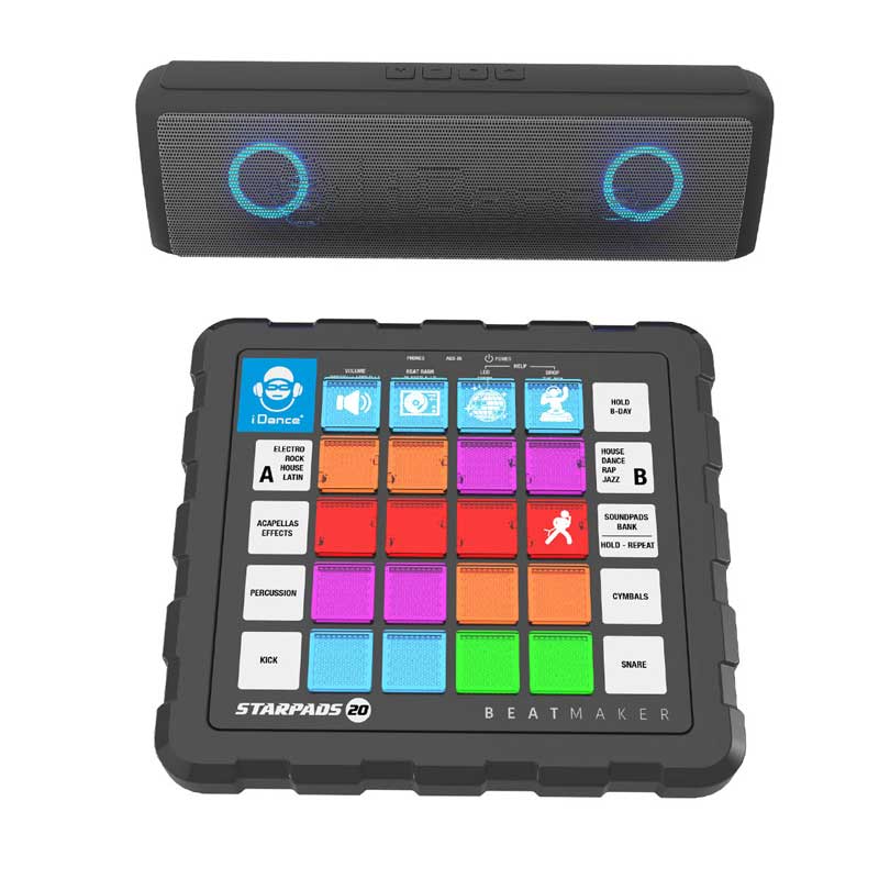 Ти създаваш ритъма на купона с новия DJ бийтмейкър от iDance! Комплектът включва бийтмейкър, саундбар, USB кабел за зареждане и аудио кабел за лесно свързване. Използвай миксера, за да създаваш бийтове и тракове с някой от включените музикални жанрове: рок, хаос, латино и електро. Експериментирай с двата плейъра, ехо ефекта и LED светлините на бутоните. Свържи бийтмейкъра и саундбара с aux кабела и включи с Bluetooth към твоя телефон, за да слушаш любимите cи песни. С чист звук и силен бас, саундбара е компактен и лек за купон по всяко време. Стани професионален DJ, създавай мелодии и се забавлявай с музикалните продукти от iDance!