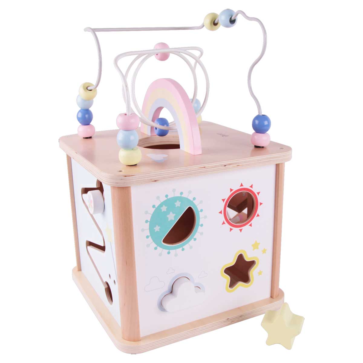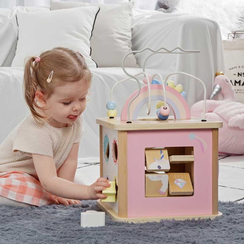 Тя ще спомогне децата да придобият много умения, които са от решаващо значение за правилното им развитие. Научават за цветовете, формите и животните, докато се забавляват. Всяка страна от куба предлага ново предизвикателство за децата. Лабиринтът с малки топчета и блокчетата пъзел с изрисуван еднорог ще им помогнат в развитието на логическото мислене. Сортерът от другата страна пък спомага за развиване на сръчността и логиката.