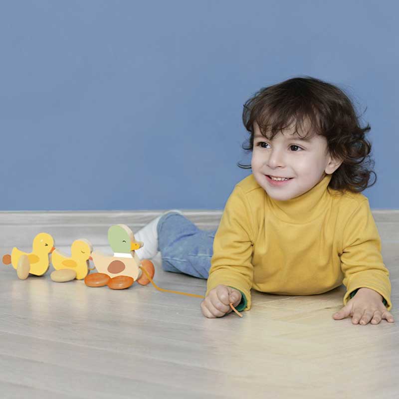 Изработенa от естествено, екологично чисто дърво, дървената играчка за дърпане на Classis World ще насърчи развитието на двигателните умения на Вашите мъничета. Уникалният ѝ дизайн я прави интересна за най-малките. С удобната връвчица за дърпане, тя ще бъде верен приятел в разходките на Вас и Вашето дете. Докато мъничето дърпа цялото семейство патета, те ще се клатушкат зад него и ще привличат вниманието му. Под формата на игра и забавление, дървената играчка за дърпане ще стимулира сетивността за координация и баланс, правейки ходенето интересно за детето.
