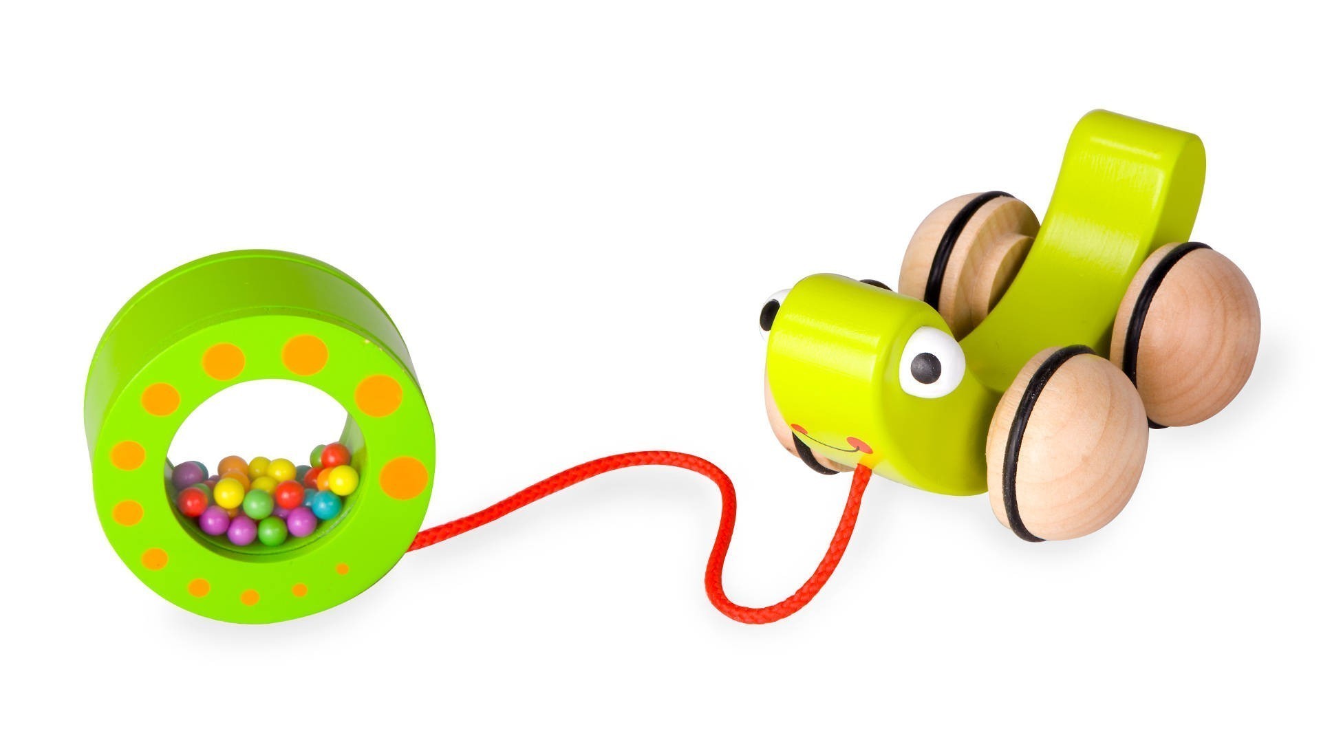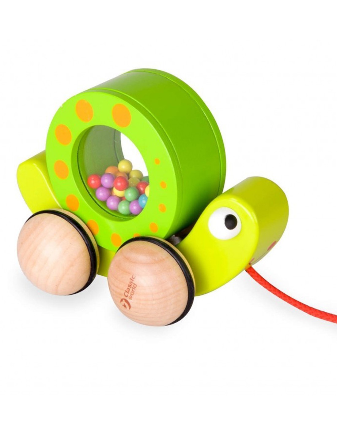 Дървен охлюв с цветна черупка, която дрънка, докато детето го дърпа. Играчката развива наблюдателността на детето към околния свят и усъвършенства двигателните му умения. Подходяща е за проходили деца, като е изработена от дърво и е оцветена с нетоксични бои на водна основа.