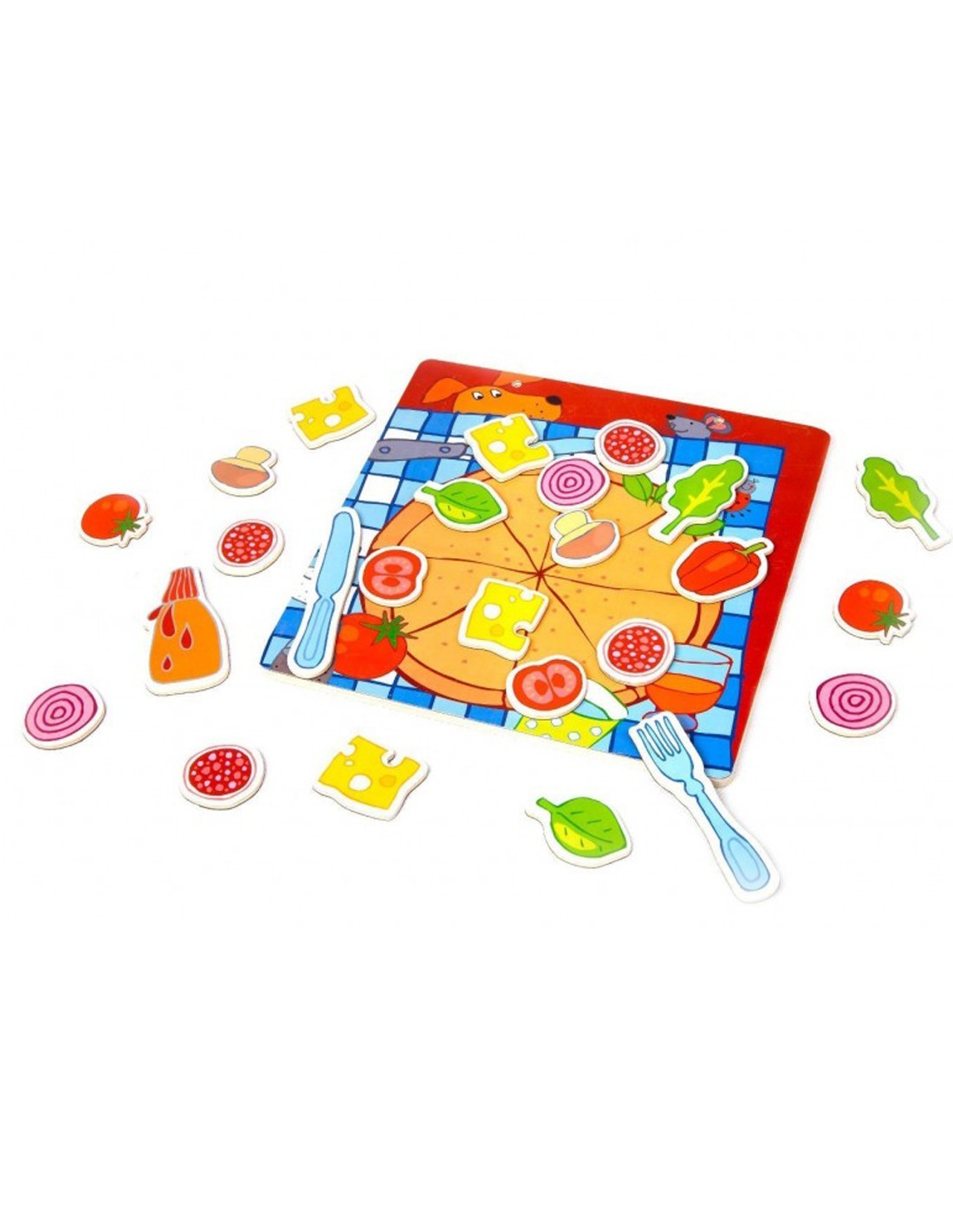 Занимателна детска дървена играчка с блат за пица и различни съставки, с които всяко едно дете може да приготви пица по собствена рецепта. Домати, сирене и гъби – това са само част от съставките, с които бъдещите кулинари могат да развихрят своето въображение. Всички елементи на играта са магнитни.