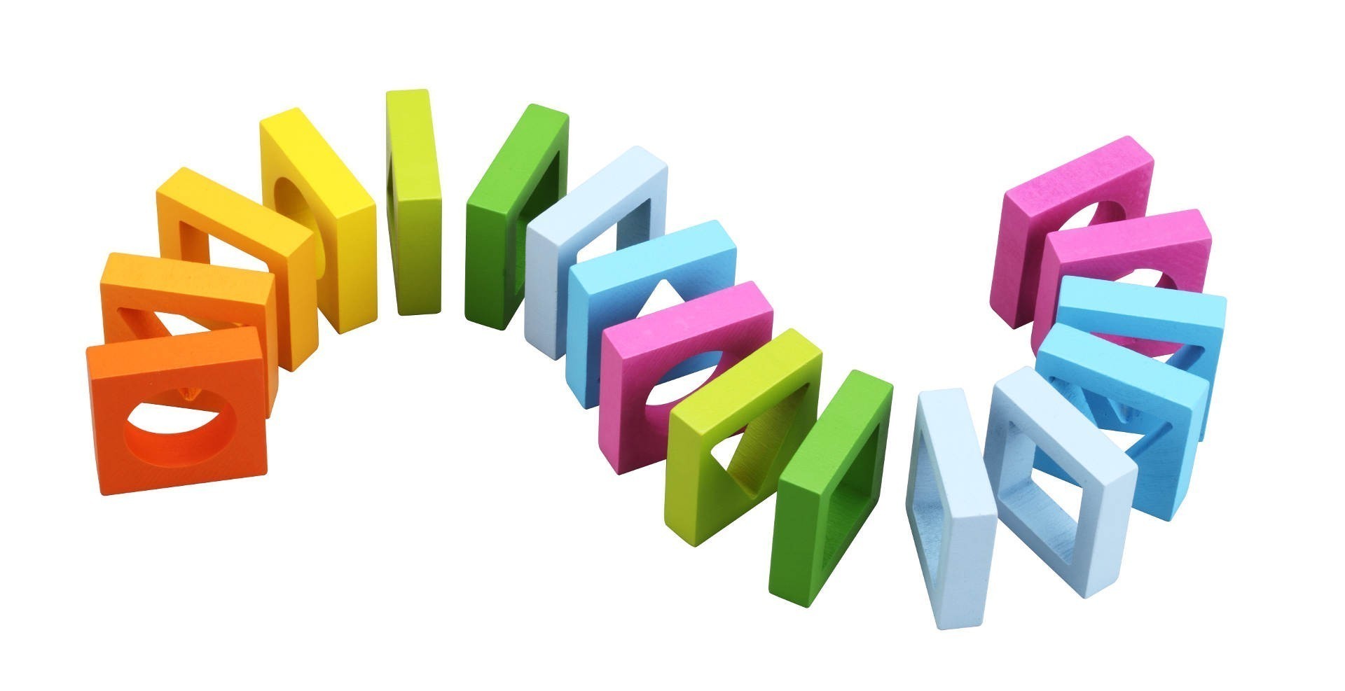 Блокчета от дърво с разнообразна геометрична форма и различен цвят.