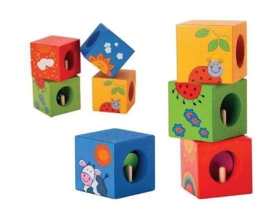 Комплектът се състои от 4 дървени кубчета, тип пъзел, които при правилното си сглобяване откриват пред детето 4 различи животни. В допълнение, във всяко едно от дървените кубчета е скрито дървено топче, звънче, въртяща се топка или дървен валяк, които издават различни звуци и засилват интереса на малките любопитковци.