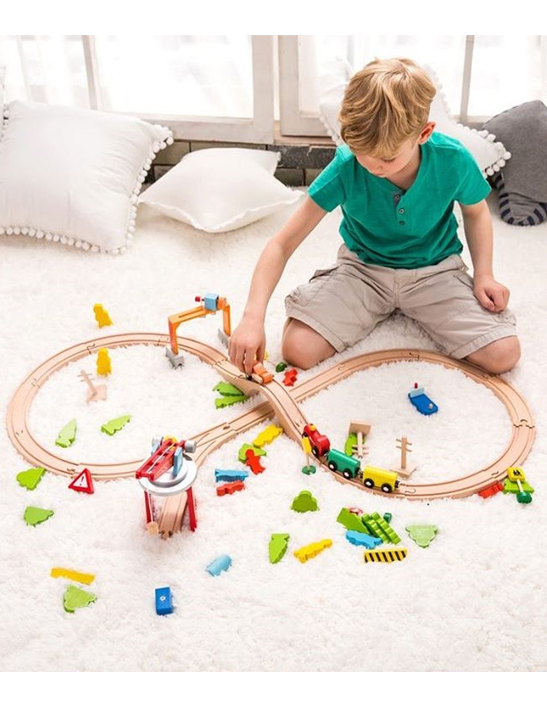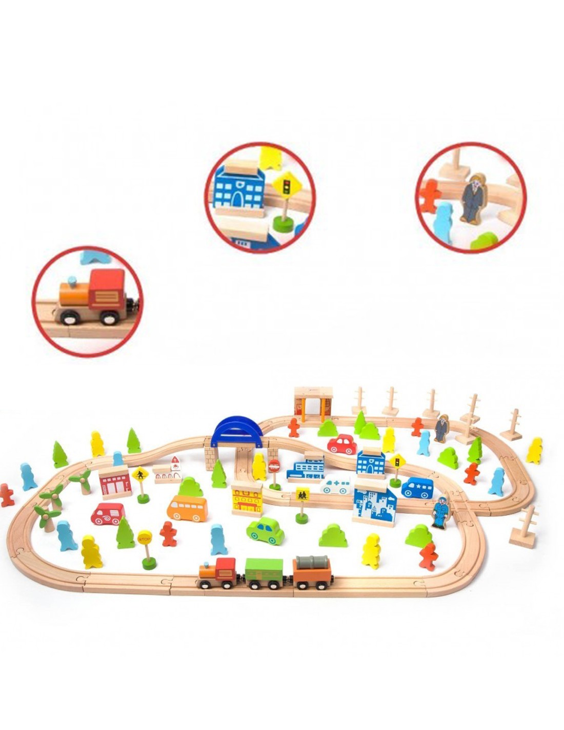 Комплектът дървено влакче с релси от 110 части съдържа много разнообразни елементи, които увеличават възможностите за игра и забавление на вашето дете. Има още работещ асансьор и товарен мост, с помощта на които детенцето ще транспортира стоки от пристанището до града, преминавайки през оживени селца.