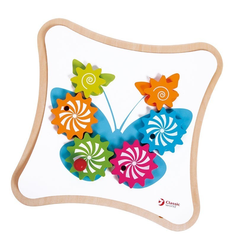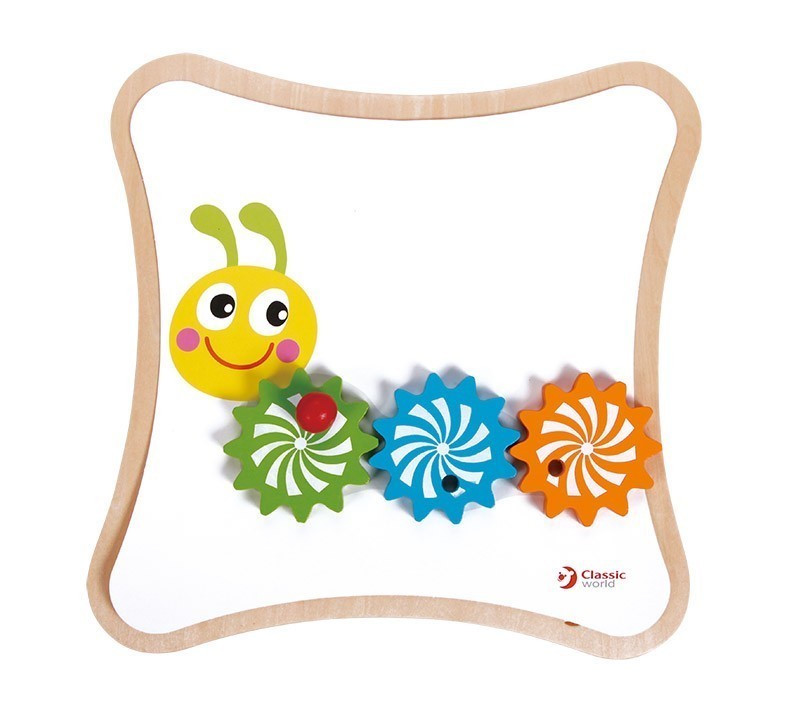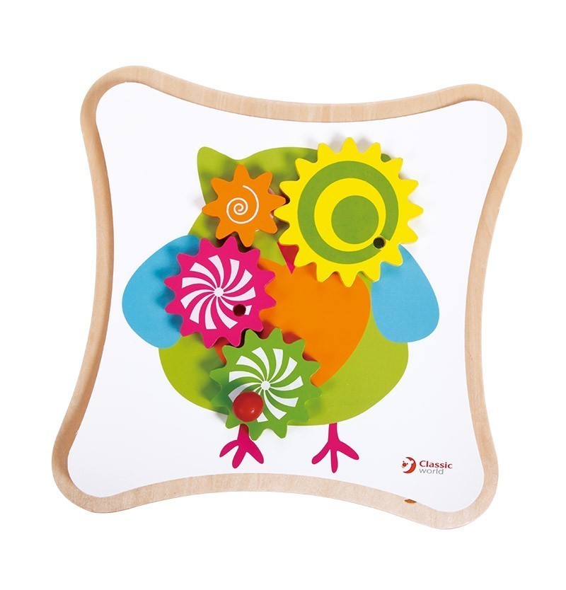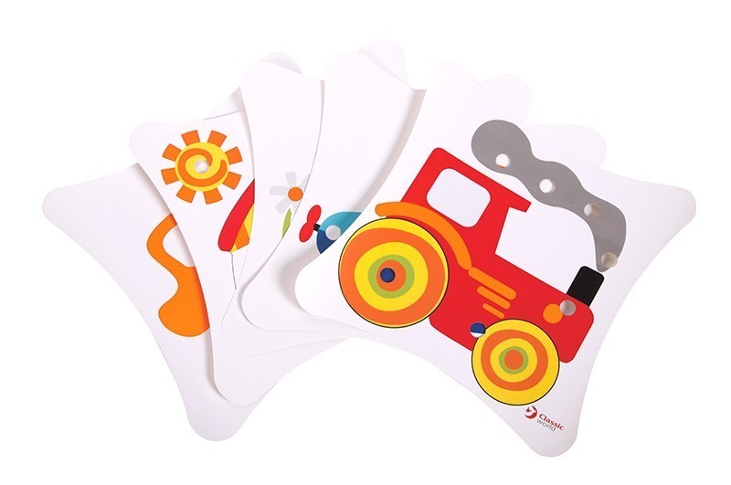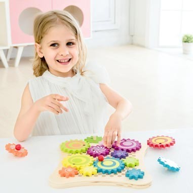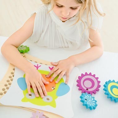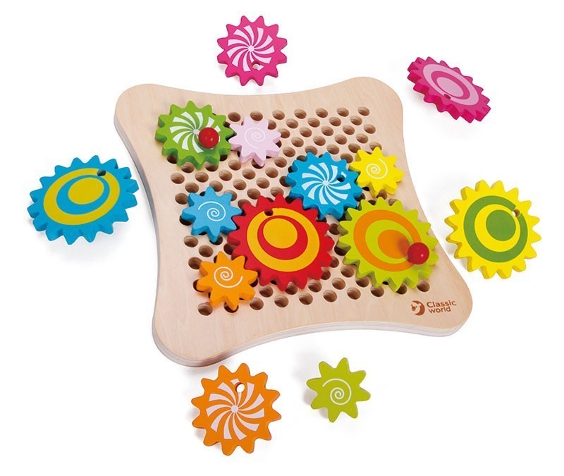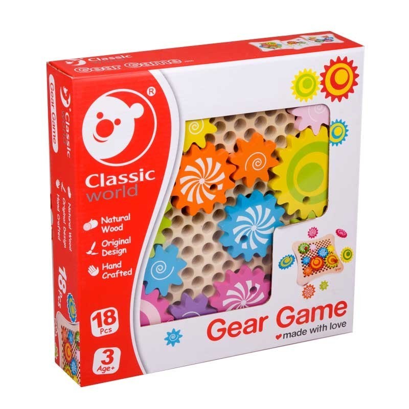Комплектът включва 18 части – различни по големина и цвят зъбчати колела, топченца и идейни карти с картинки за довършване, добавяйки им от колелата.