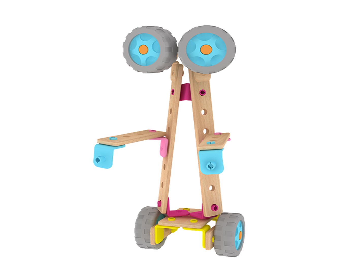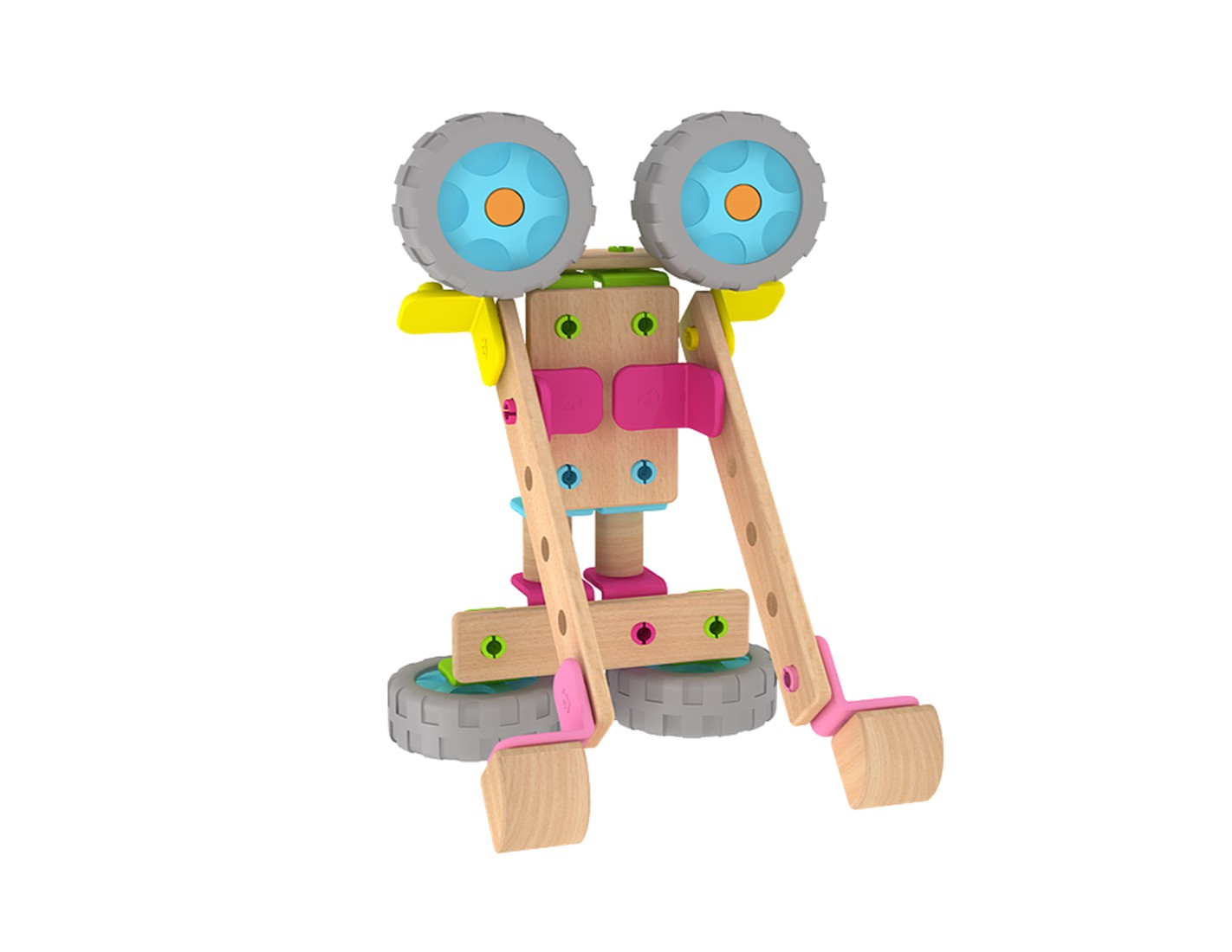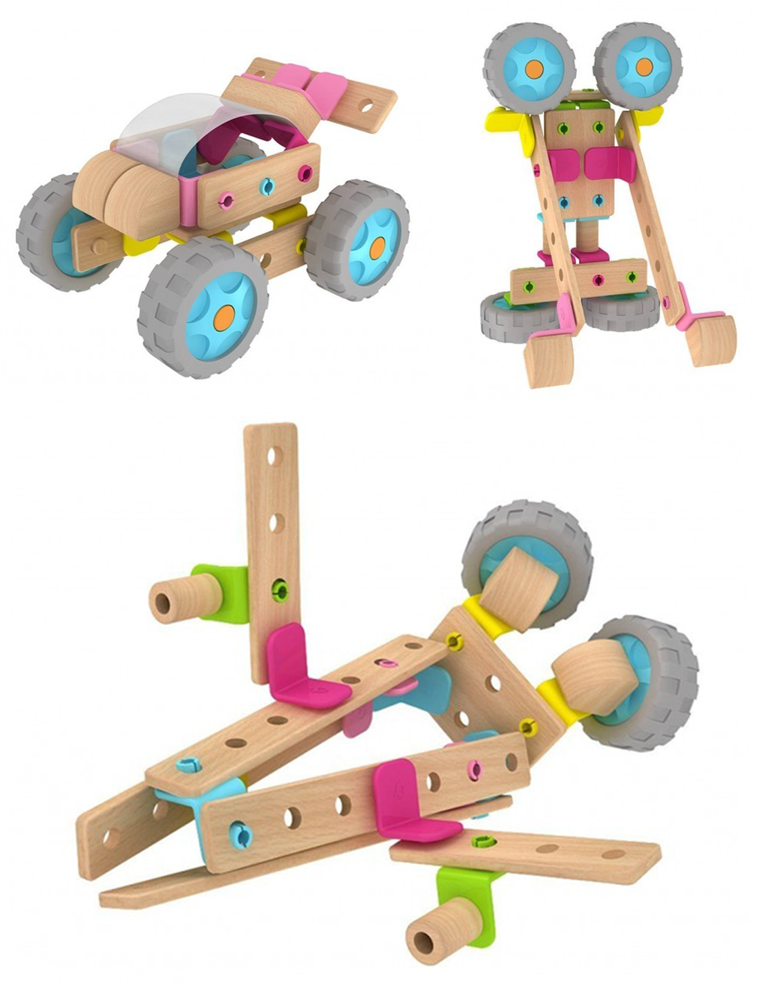 Този дървен конструктор е една чудесна играчка за всяко малко дете. Тя позволява детето да развихри своята фантазия и да сглоби разнообразни фигури с различните части, без да използва никакви инструменти. Към комплекта има и книжка с примерни фигурки за сглобяване, но сме сигурни, че вашето дете ще измисли безброй други начини да сглоби частите. Крайният резултат може да е робот, мотоциклет, състезателна кола, самолет и т.н. Може да се сглоби дори и по-голям робот с части от други конструктори от същата серия.