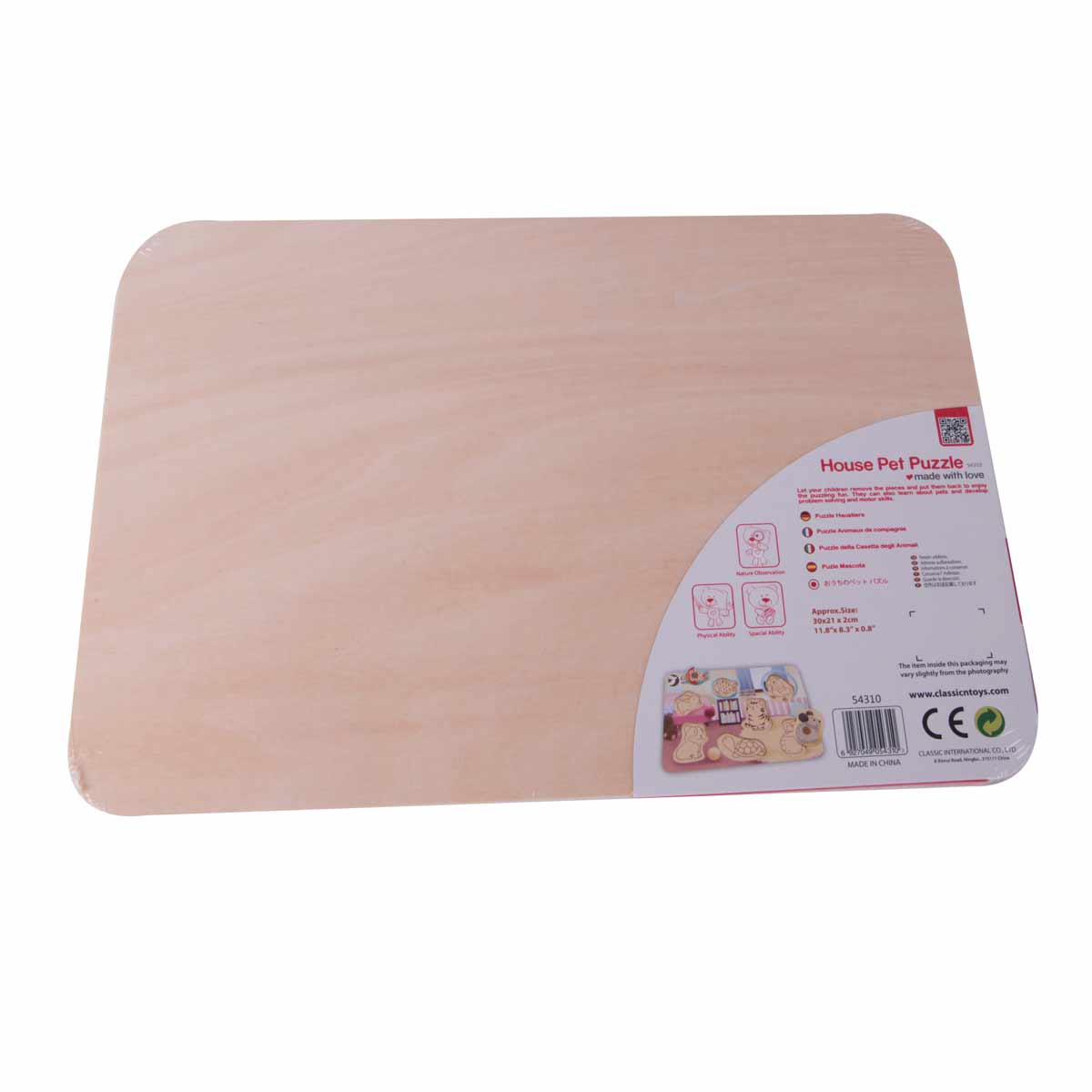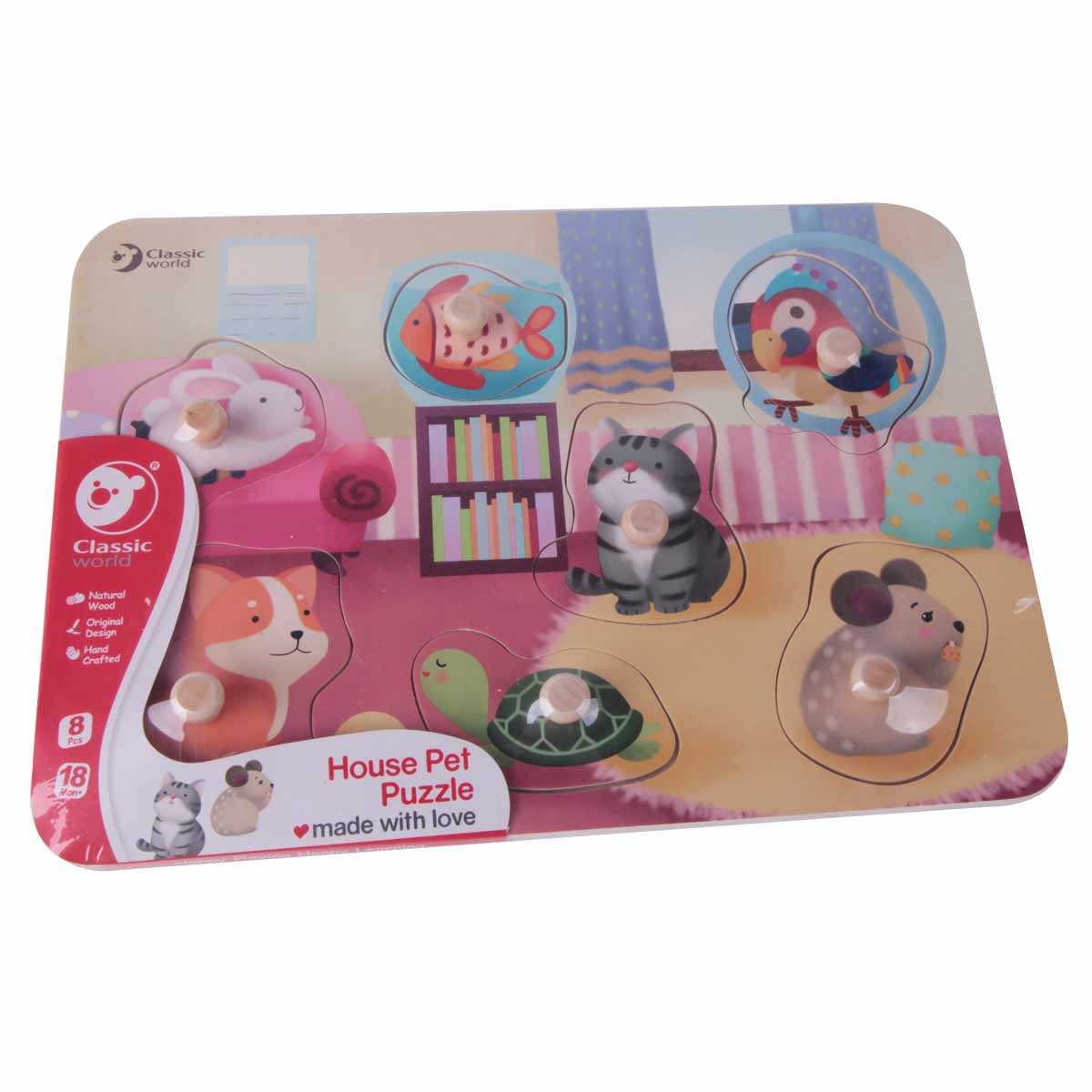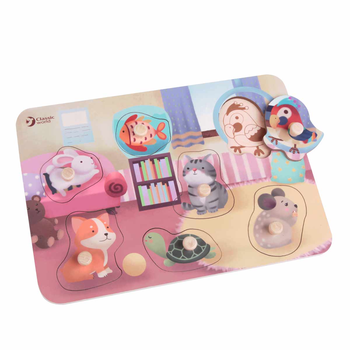 Детски дървен мини пъзел с различните домашни любимци. С него детето ви ще може да има всички животинки наведнъж – зайче, рибка, куче, коте, мишка, костенурка и папагал.