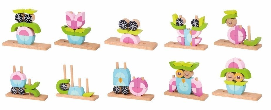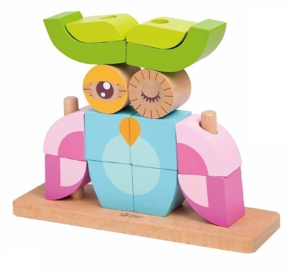 Дървена играчка – бухал, изработена от 14 дървени блокчета, които могат да бъдат комбинирани за изграждане на различни предмети и животни. Забавен и цветен, той ще подпомогне въображението на децата и ще развива у тях сръчност, креативност и усещане за форма и цвят.
