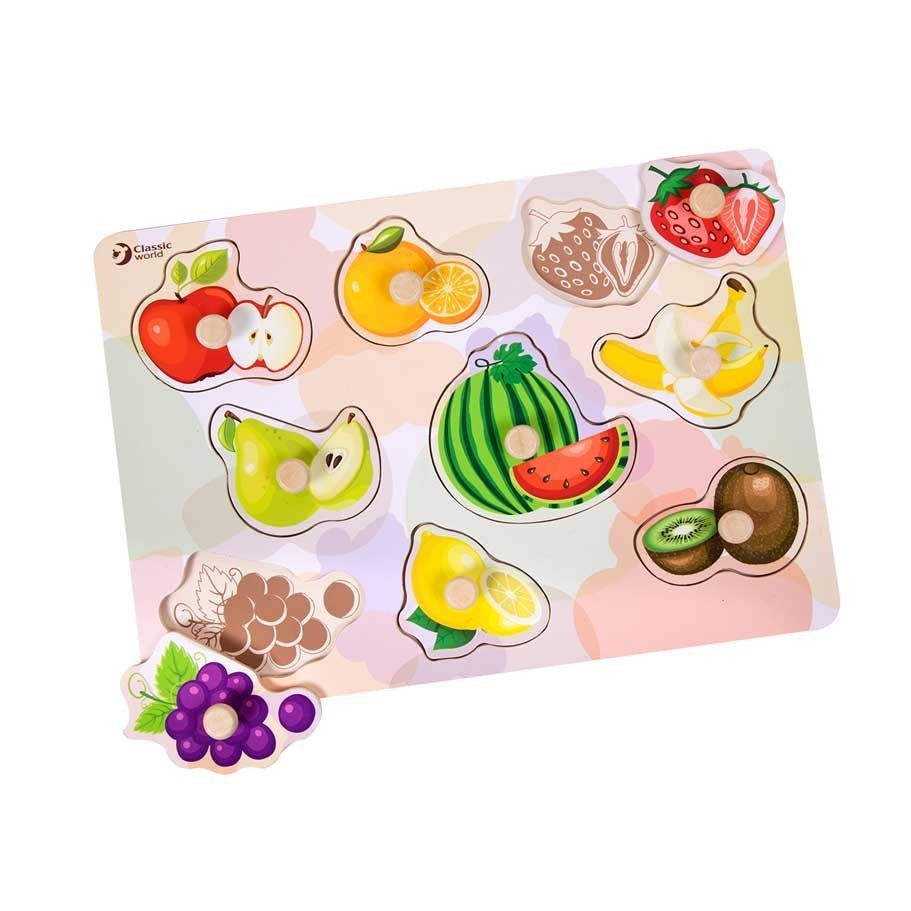 Този дървен пъзел се състои от 10 части, които помагат на децата да опознаят различните плодове и формите им. Всеки плод има малка дръжка, която улеснява поставянето му на съответното място. Тази играчка насърчава децата да откриват света около тях, както и да се справят сами с решаването на даден проблем.