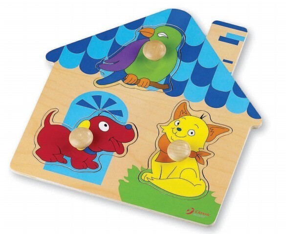 Дървен пъзел във формата на къщичка, състоящ се от три фигури за подредба – куче, котка и папагал.