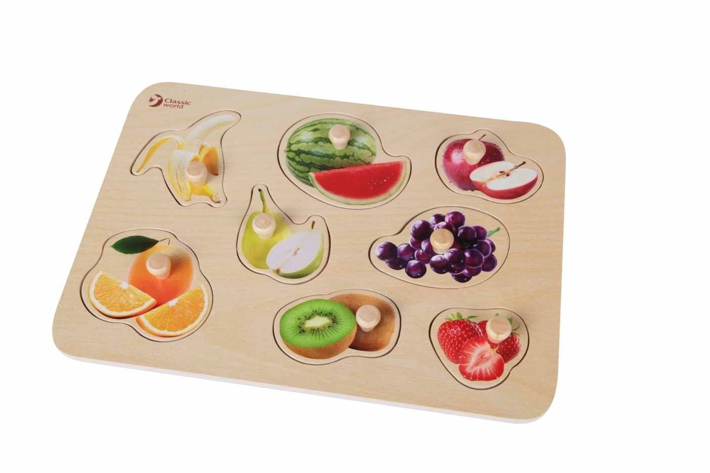 Този дървен пъзел включва осем цветни плодови парчета, всяко от които е с дървено копче, позволяващо лесно захващане от малките деца. Има различни видове плодове в комплекта, като: киви, диня, ягоди и др. Цветни, съвпадащи картини се появяват под всяко парче. Перфектен пъзел за деца, който развива координация на ръцете и очите, фини двигателни умения, способности за визуално възприятие и начален речник!