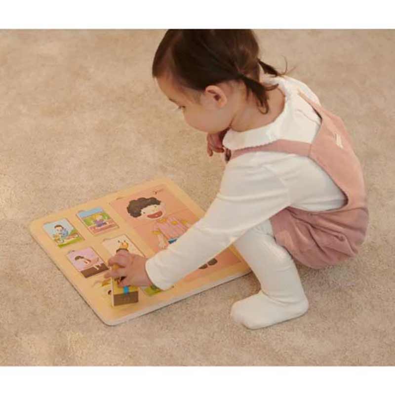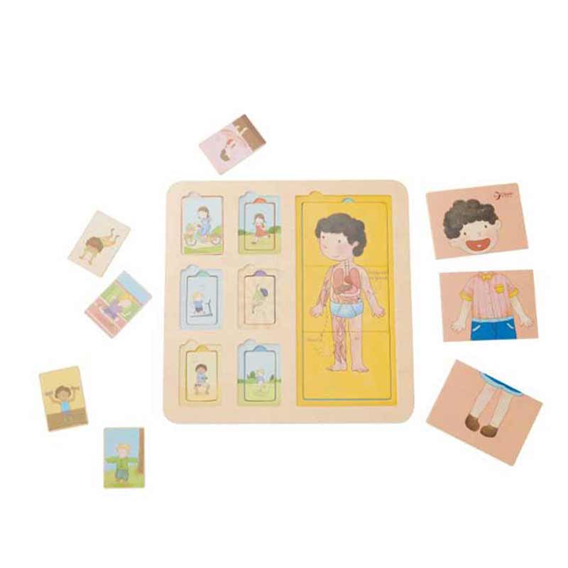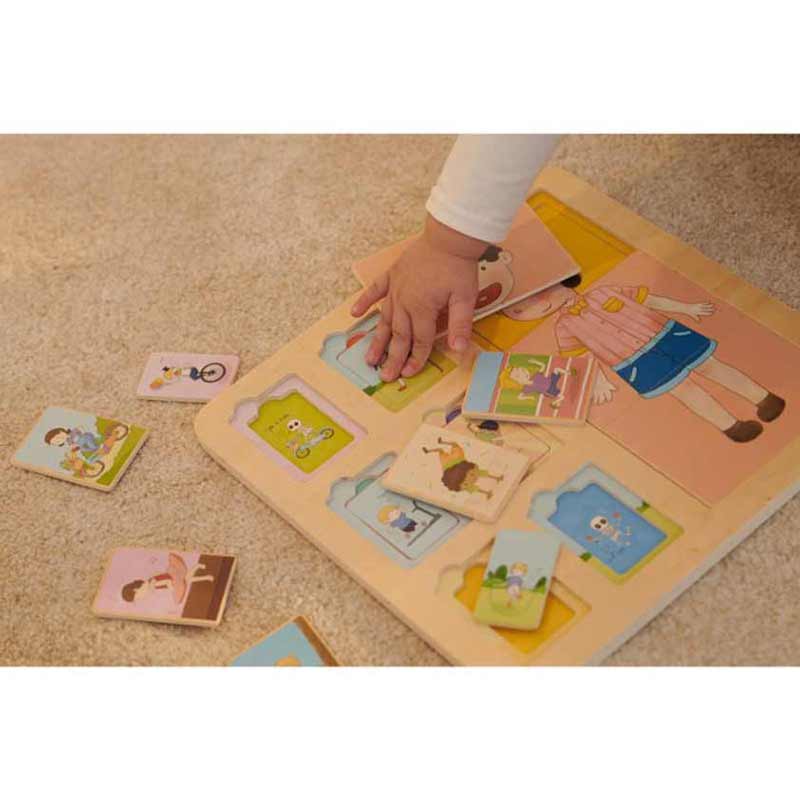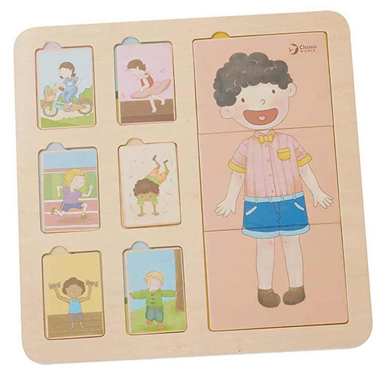 Дървеният пъзел с фигурки на деца на Classic World за децa от 12 месечна възраст, са идеалното решение за дома и детската градина. Комплектът се състои от дъска с 18 цветни блока с изрисувани деца, които изпълняват различни упражнения.