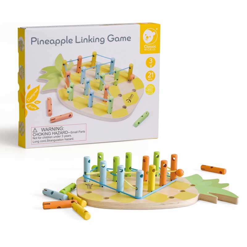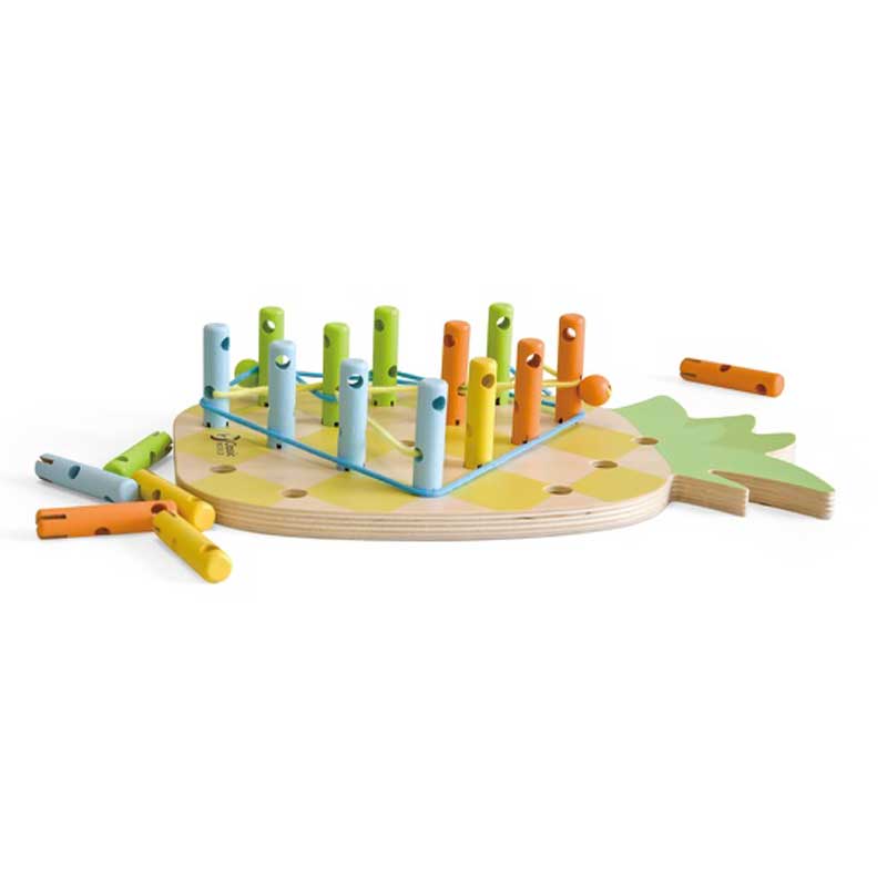 Играта „Сладък ананас“ включва дървена дъска във формата на ананас и дървени пръчици с дупки, през които трябва да се прекара въженце. Този процес на прецизност и концентрация подпомага развитието на моториката и уменията за решаване на задачи.