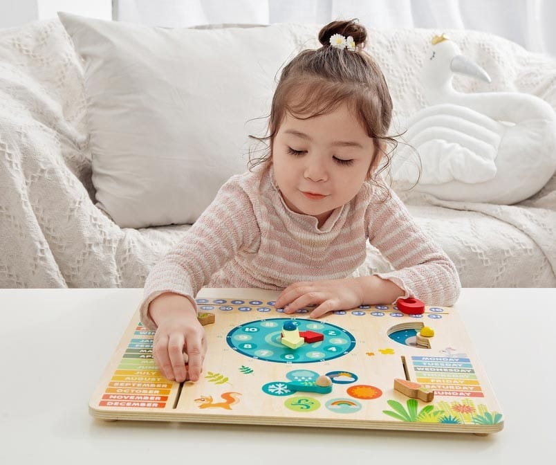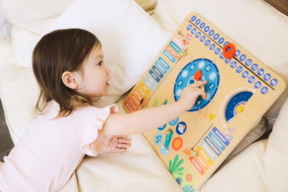 С нея децата се научават да разпознават различните дни и месеци /на английски/, както и се запознават със стрелките на часовника. Добавени са възможности децата да отбелязват и сезоните, както и времето навън – дали вали дъжд или сняг, слънчево или облачно е и др. Играчката е подходящ подарък за всяко малко дете на възраст над 2 години.