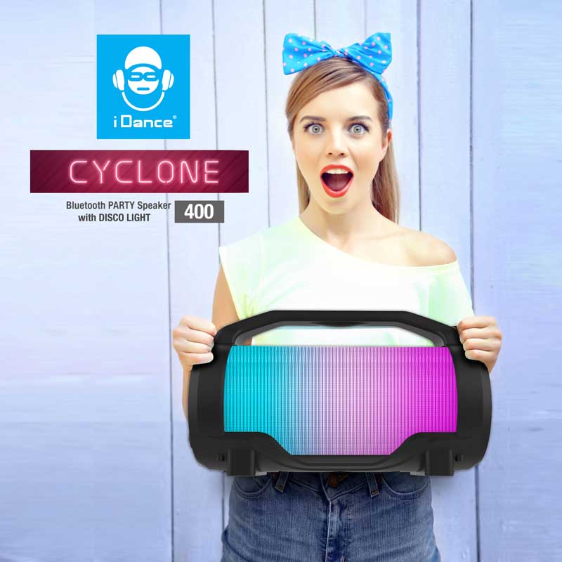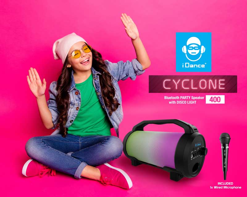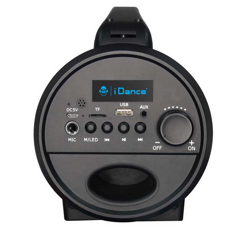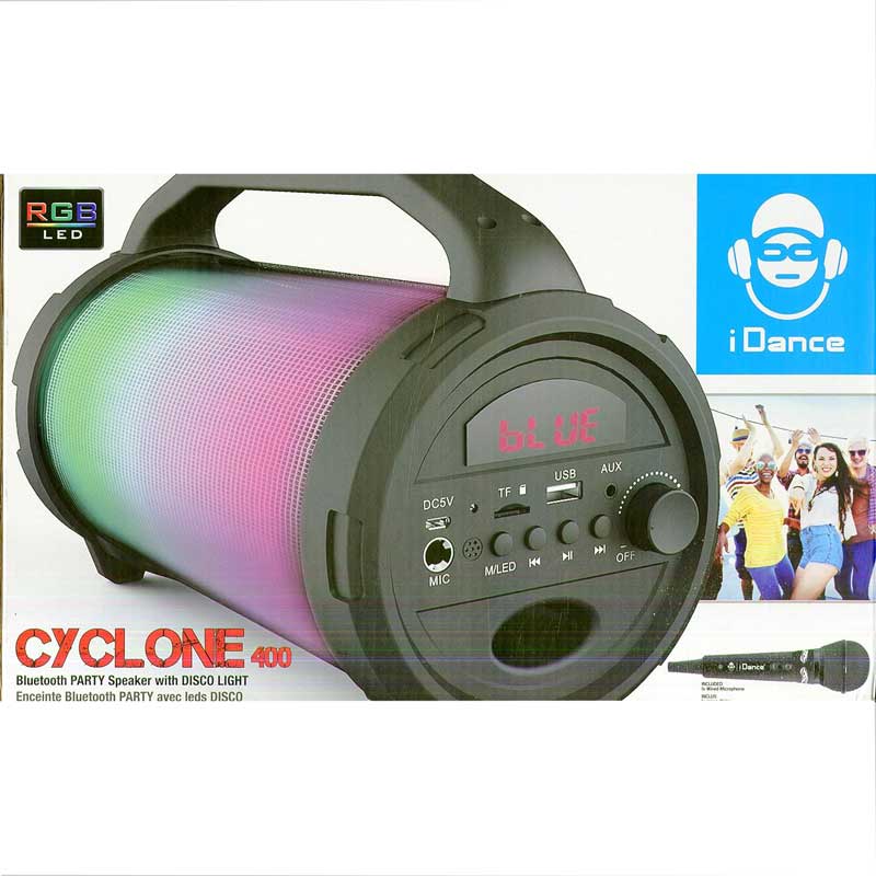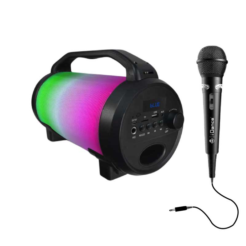 Сега е моментът да бъдеш звезда с караоке тонколона iDance! Комплектът включва черна тонколона със светлини, USB кабел и микрофон за всяко парти. Удобна и лесно преносима, тя се свързва с Bluetooth връзка към твоя телефон, таблет или компютър. Тонколоната свети в различни LED светлини, според жанра и бийта, с отлично представяне на звука. Батерията има дълго време на възпроизвеждане, а зареждането ѝ става чрез USB портал. Бутоните и жаковете са позиционирани отстрани за по-добра ефективност и комфорт. С 360° стерео звук, преносимата тонколонка е перфектният начин да носиш купона навсякъде със себе си, а микрофонът ще запечата всички караоке моменти с твоите приятели.