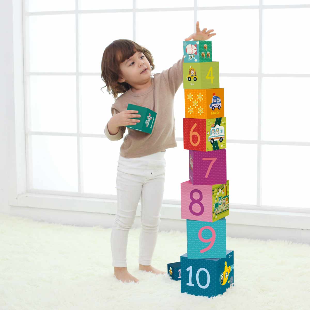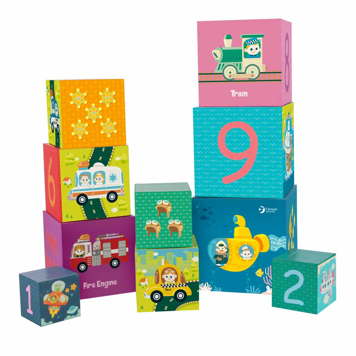 Цветни кубчета от CLASSIC WORLD, изобразяващи различните видове транспортни средства. Комплектът се състои от 10 квадратни кубчета с различни размери, като всеки куб има свой номер и различен цвят. Страхотно е децата едновременно да строят, да научават номерата, цветовете, размерите и транспортните средства. Детето може да си построи и кула в различни варианти. Кубчетата могат да се използват като място за съхранение на различни предмети, като пастели или химикали.