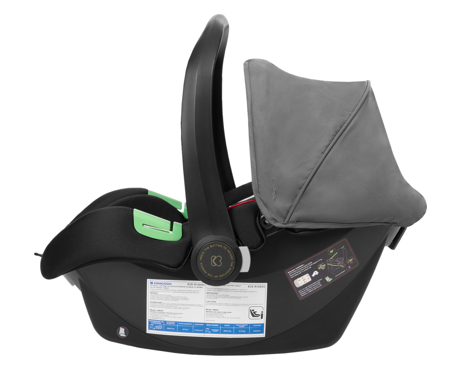 • Тествано в съответствие с Регламент за изпитване ECE R129/03 от TÜV SÜD. Включени аксесоари: Покривало за крачета на седалката, адаптори, чанта, поставка за чаша, комарник.