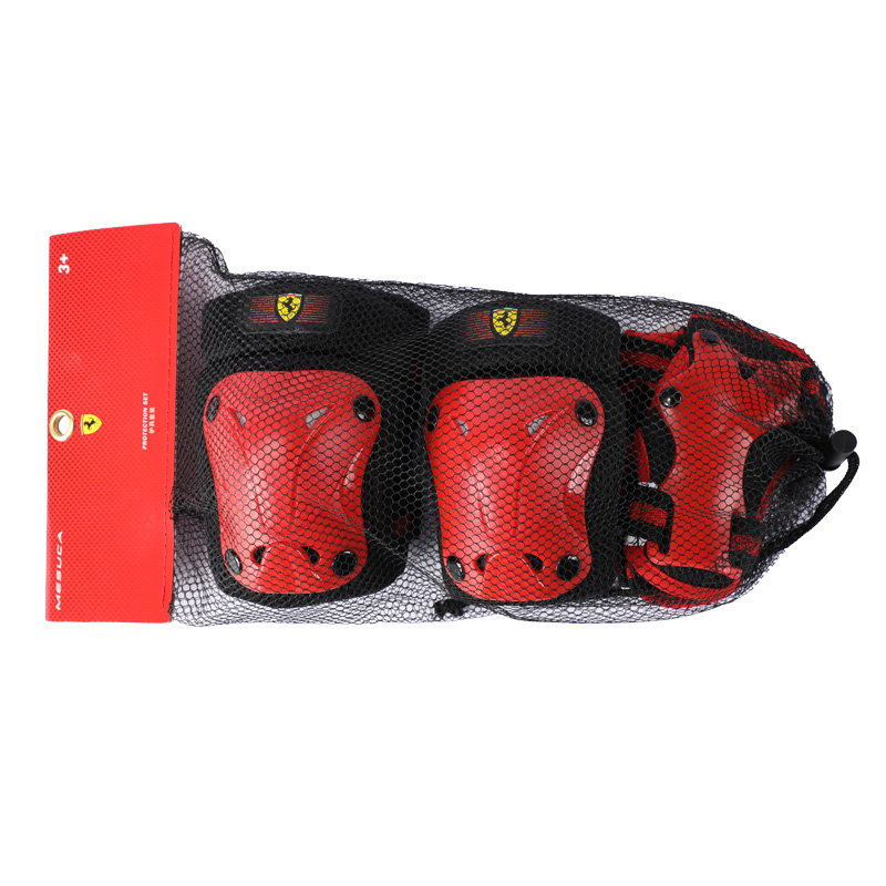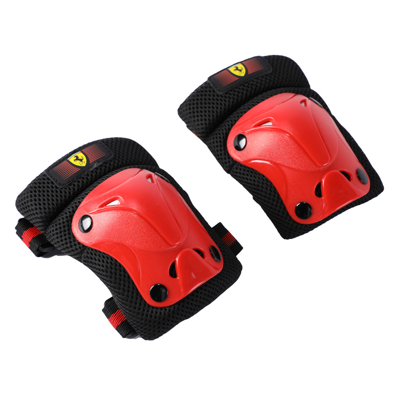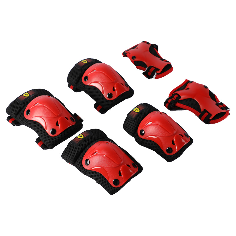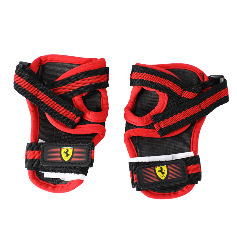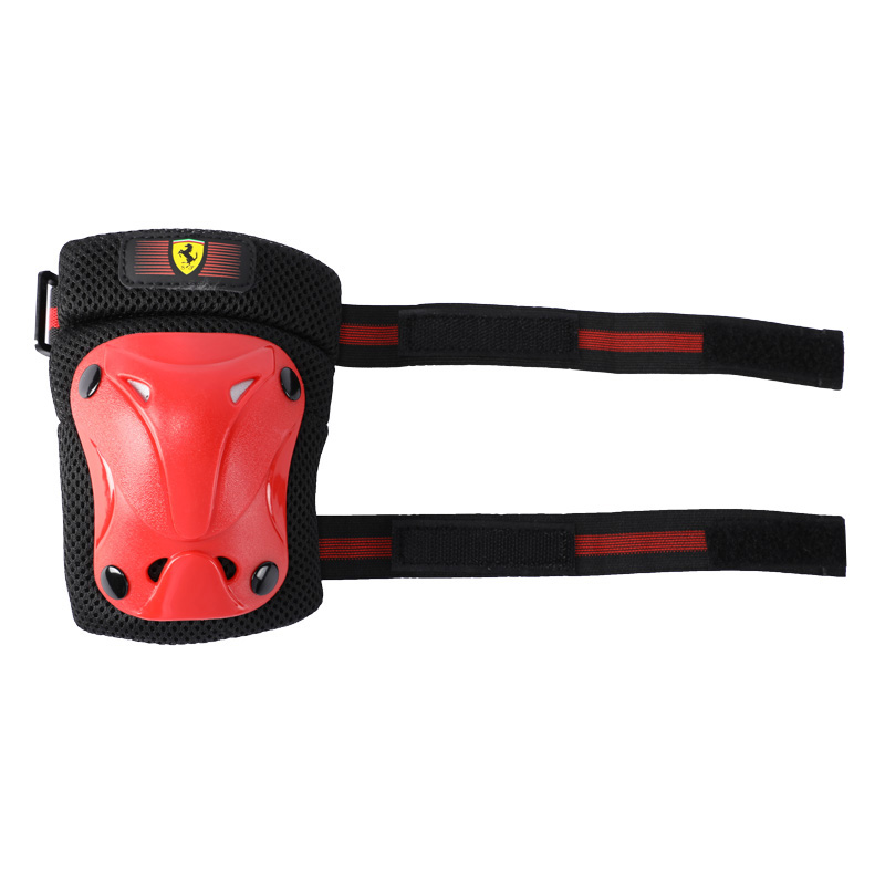 Детски протектори Ferrari – комплект от налакътници, наколенки и предпазители за дланите в присъщата за марката комбинация от червен и черен цвят, налични в различни размери – XXS, XS и S. Защитете децата си с тези предпазни аксесоари Ферари и им помогнете да имат стилни и най-вече безопасни занимания с любимите си превозни средства – велосипеди, тротинетки, ролери или скейтбордове.