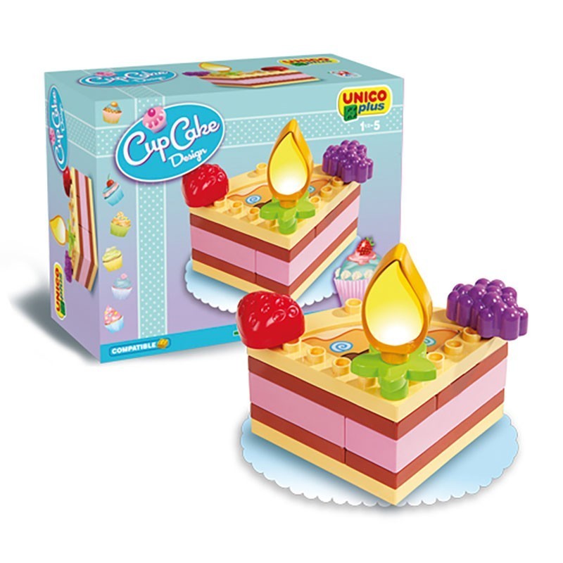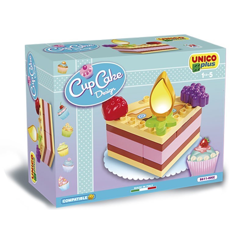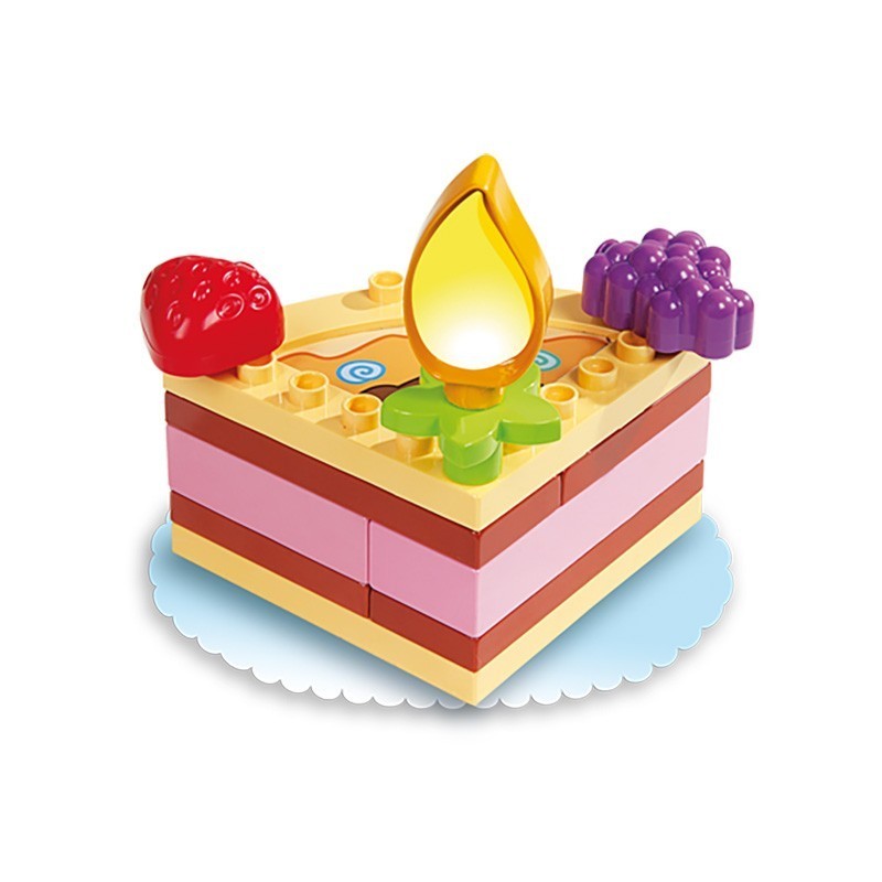 Конструктор за деца, състоящ се от 14 части в различни размери и цветове, с които децата могат да сглобят парче от торта със свещичка.