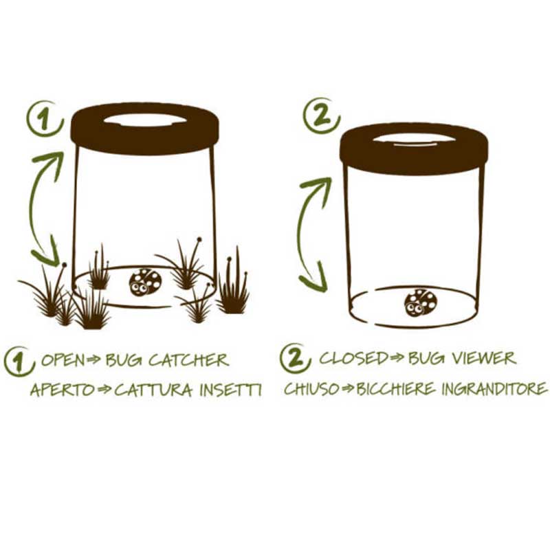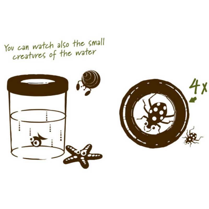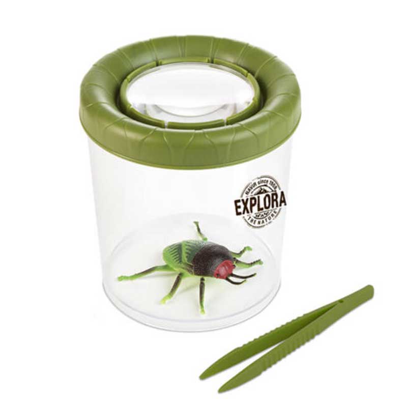Този иновативен уред е създаден за улавяне и наблюдение на различни видове буболечки, бръмбари, паяци, пеперуди, малки водни обитатели и други дребни пълзящи животинки. Той може да се използва по два начина – като кутийка за директно улавяне и наблюдение на буболечки и като аквариум за малки рибки и попови лъжички. Контейнерът е със зелен капак и с размери 11 x 11 x 12 см и 100 мм диаметър, а лещата за наблюдение – с диаметър от 62 мм и увеличение 4 пъти. Продуктът идва при вас в опаковка от рециклиран крафт картон, отпечатана с мастило на водна основа.