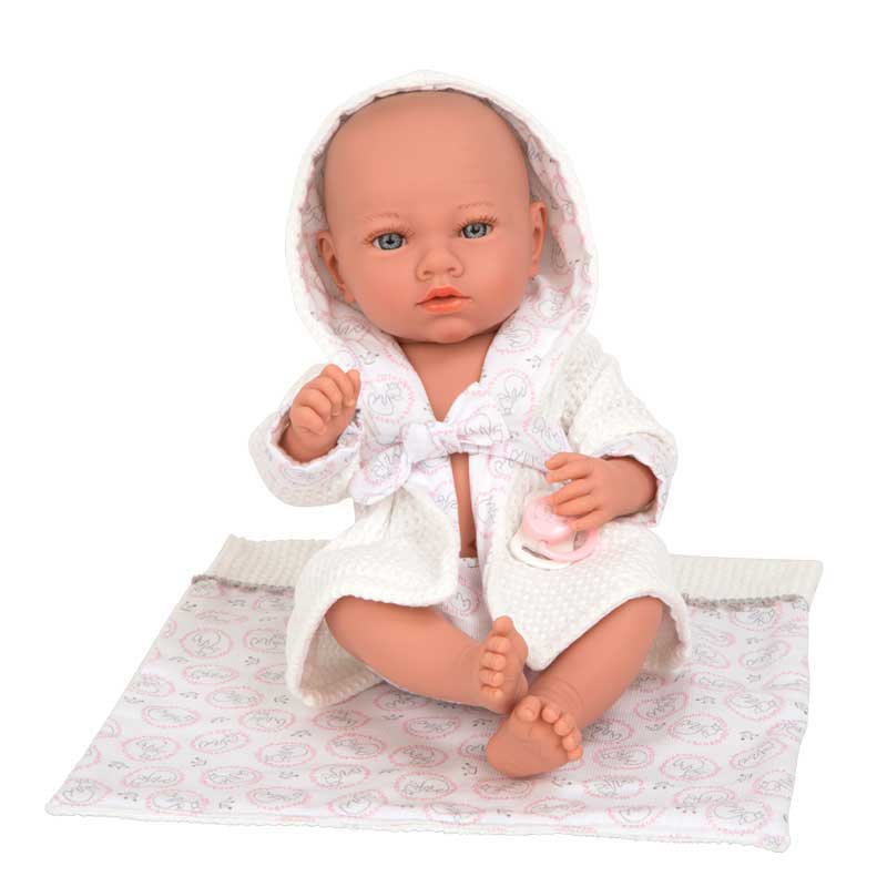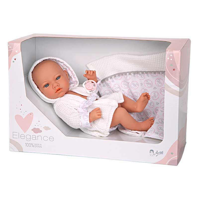 Тази невероятна кукла-бебе, част от забележителната колекция „Elegance“ на испанската марка Arias, въплъщава в себе си внимание към детайла и удивителна прецизност. Всяка част от нея е ръчно изработена – чертите на лицето, изразителните сини очи и гънките по тялото ѝ, напомнят на истинско бебе. Кукла-бебе Ария е висока 38 см и е изработена от висококачествен винил, приятен на допир. Очарованието ѝ се засилва още повече от нежния аромат на ванилия, който се носи около нея. Ария обожава да играе след баня, затова тя е с подходящ халат с качулка в бял цвят в допълнение с мека хавлия в същия тон. Всяка малка госпожица ще прояви желание да се грижи за нея, да я гушка и играе. Времето прекарано с кукла-бебе Ария, е не само забавление, но и учи момиченцата на внимание и отговорност към околните.