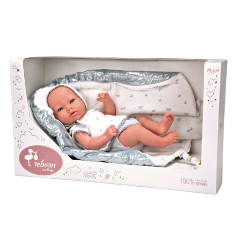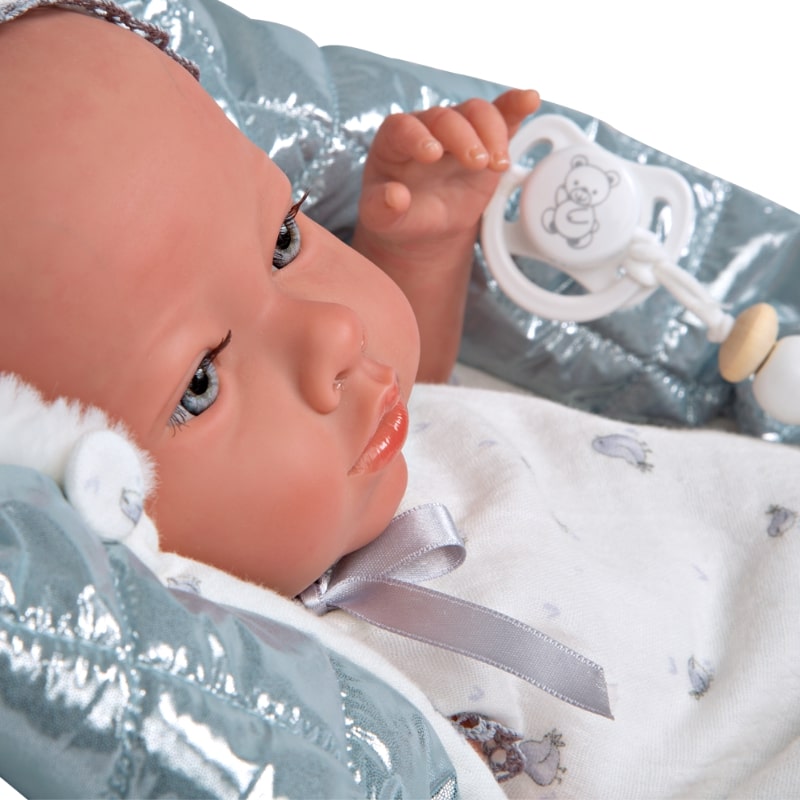 Очарователната кукла-бебе Бория с блестящо сиво одеялце и биберон – перфектната играчка за всяко дете