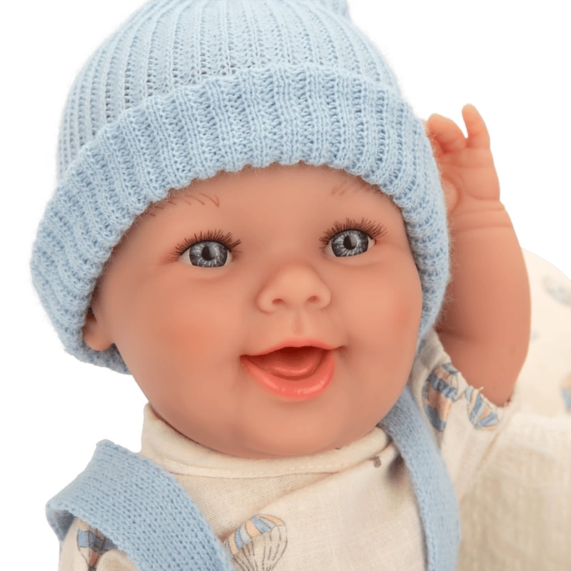Кукла-бебе Гауди със син гащеризон и бял кош – премиум качество и визуален разкош