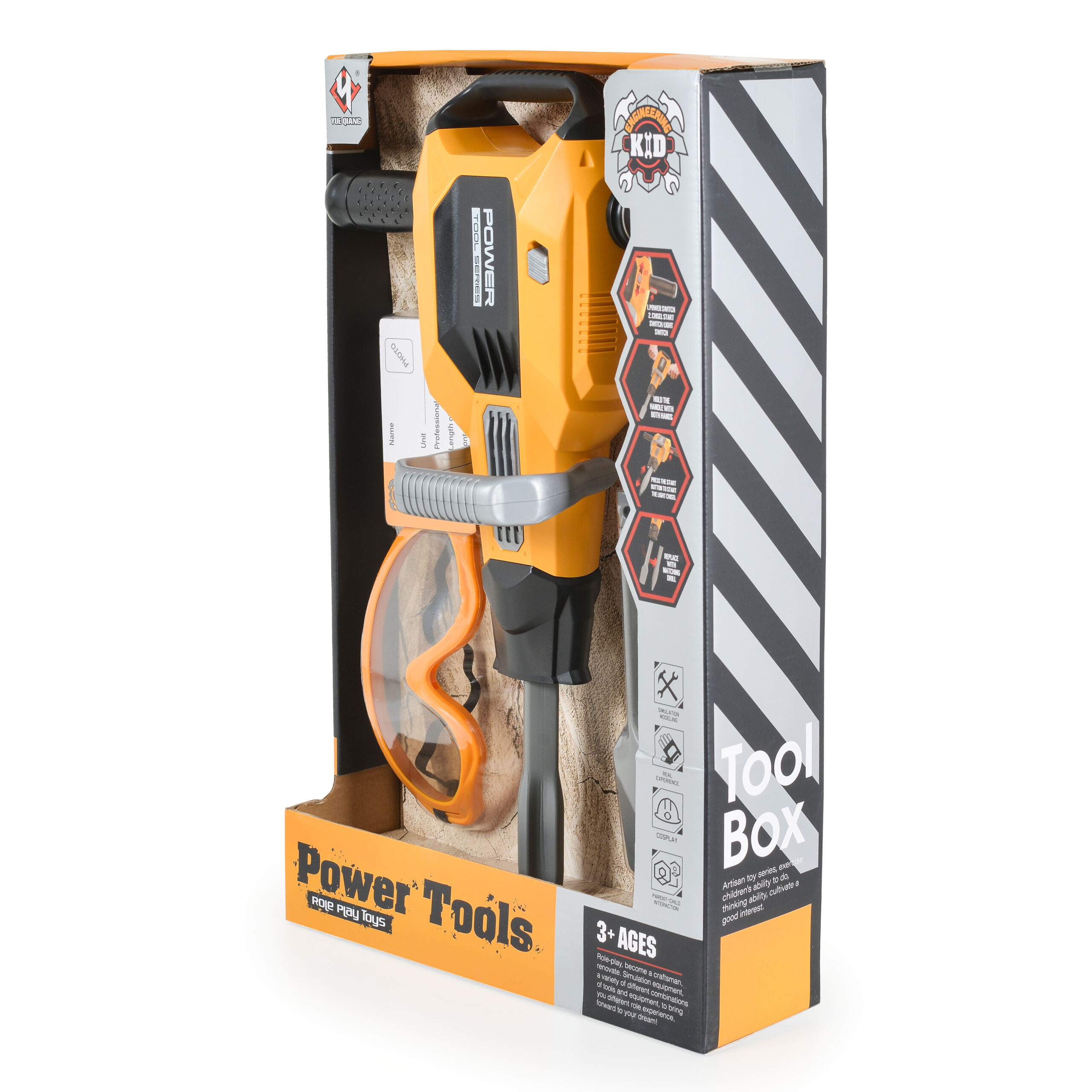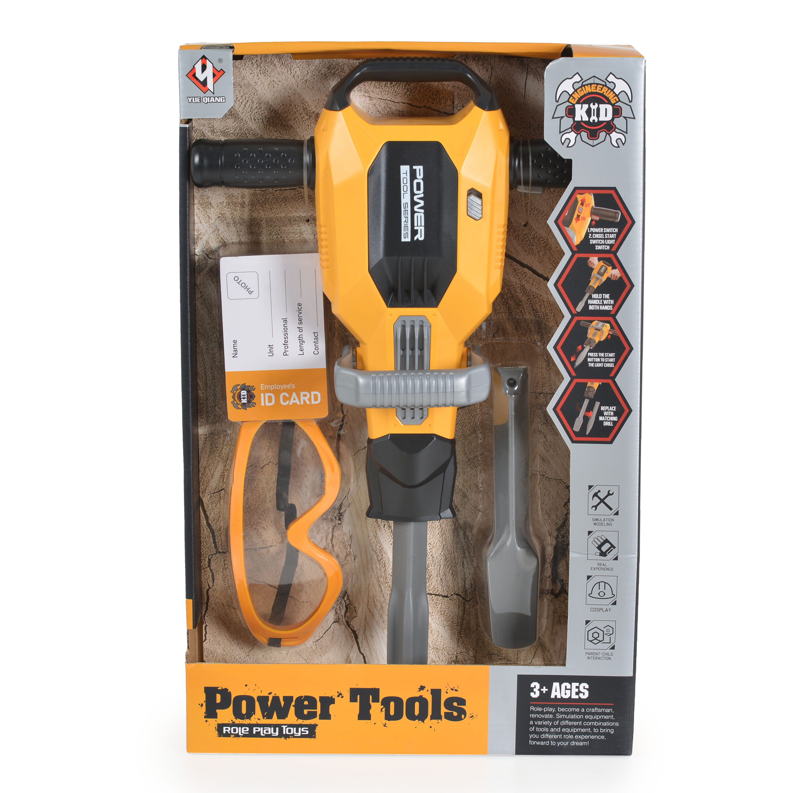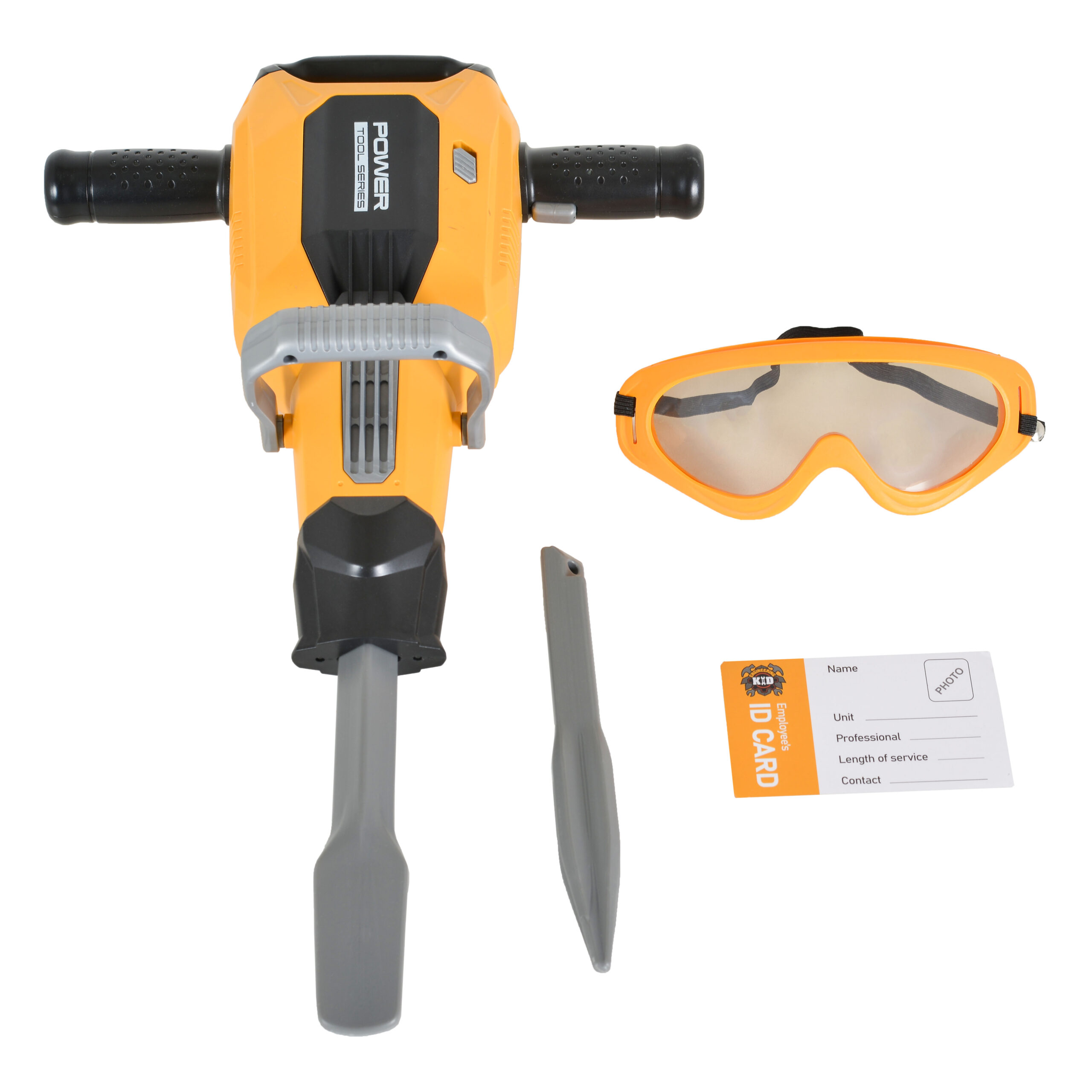 Комплектът включва и предпазни очила/маска, които добавят допълнителен реализъм и безопасност към играта, както и служебна карта, която детето може да надпише и дори да добави своя снимка – идеалният завършек на строителната екипировка!