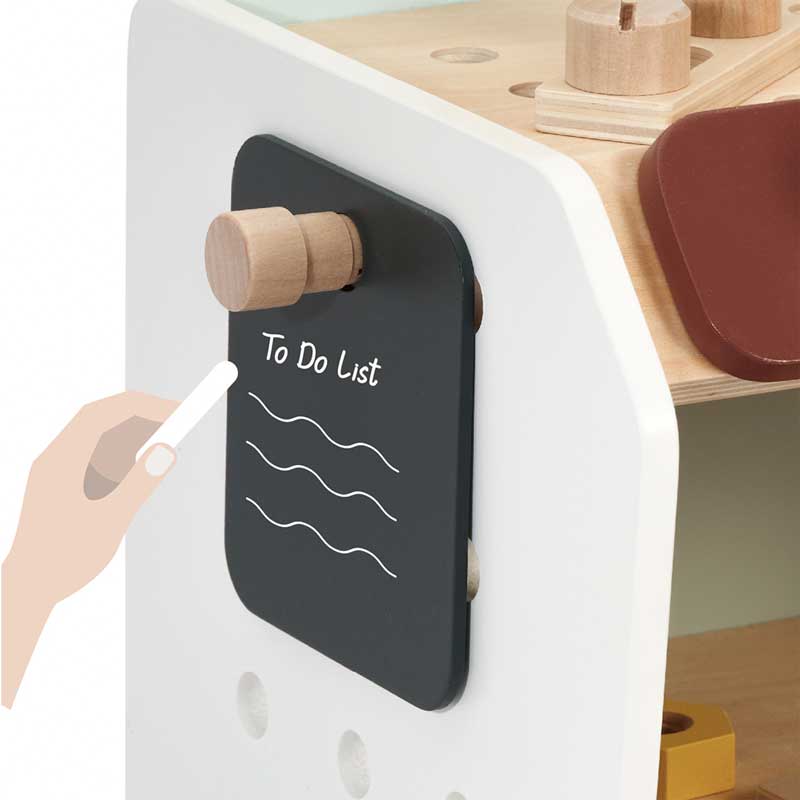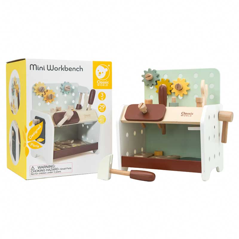 Малка дървена работилничка за игра за всеки бъдещ майстор! Този настолен работен дървен плот разполага с всички инструменти, от които се нуждаете, за да извършвате дърводелска дейност и да майсторите разни неща. Комплектът е с размери: 25 x 20 x 30 см и включва: