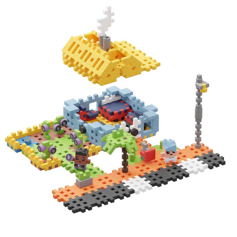 Фигурките – момче със синя коса и усмихнат приятел с папионка – добавят характер и провокират ролеви игри, истории и ежедневни ситуации от градския живот.