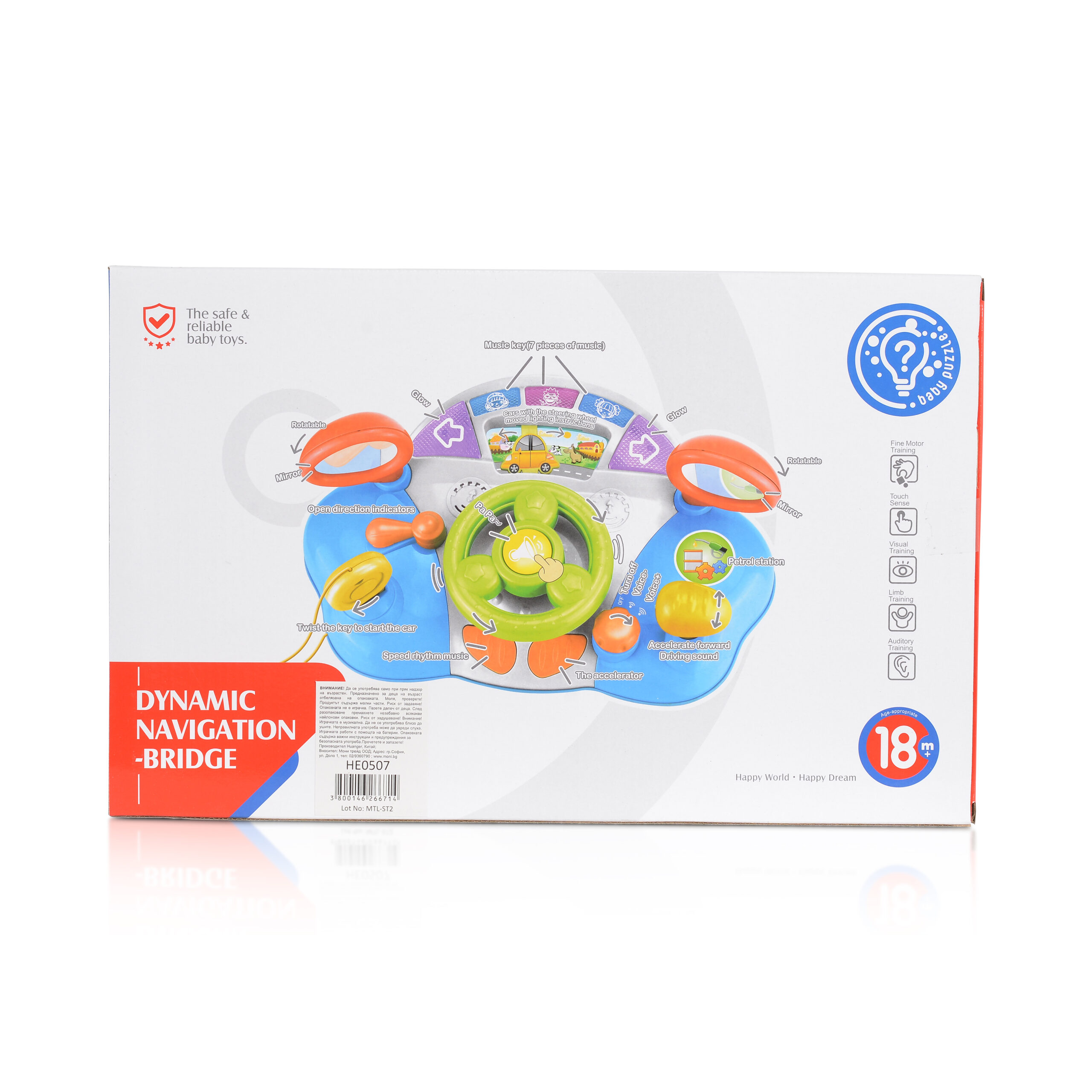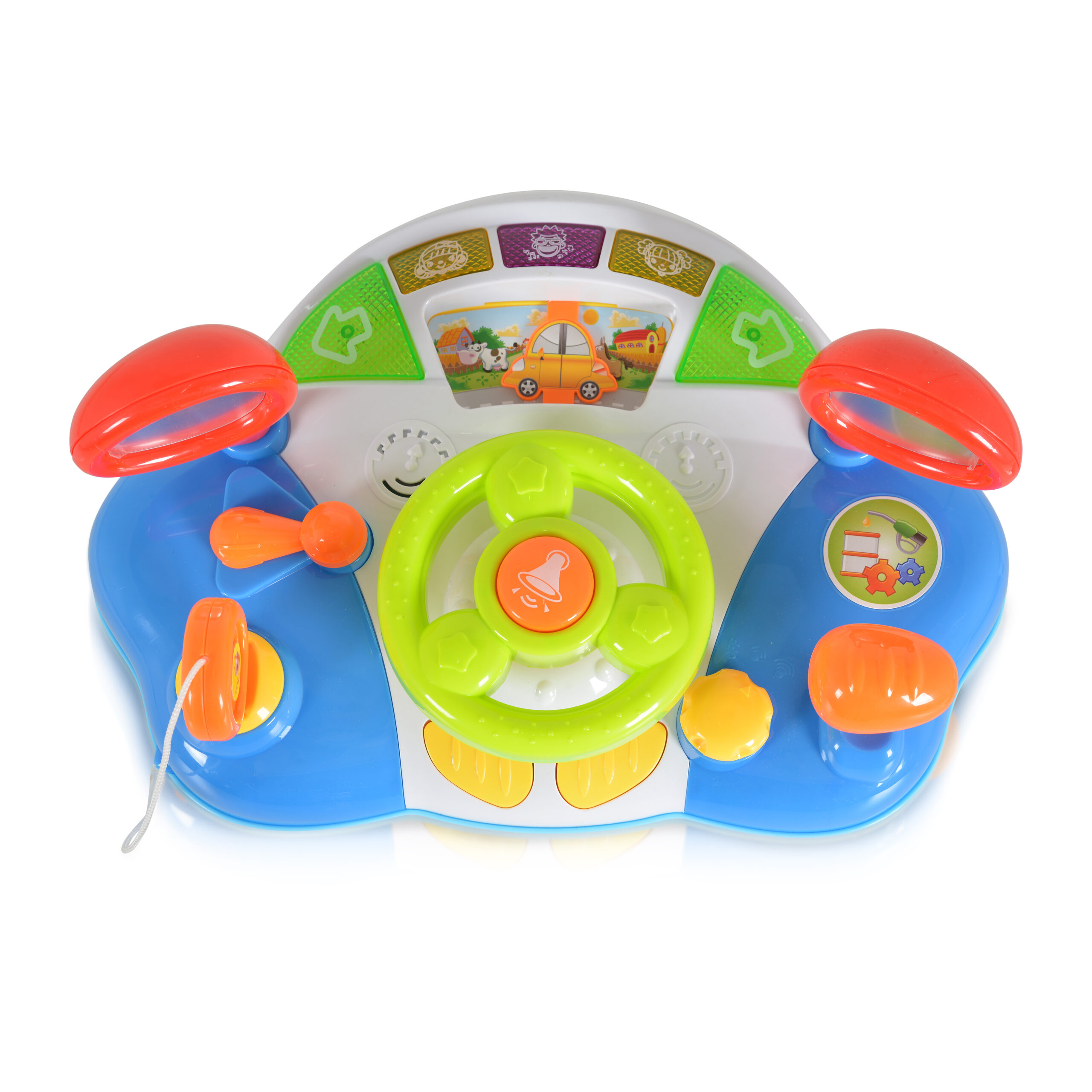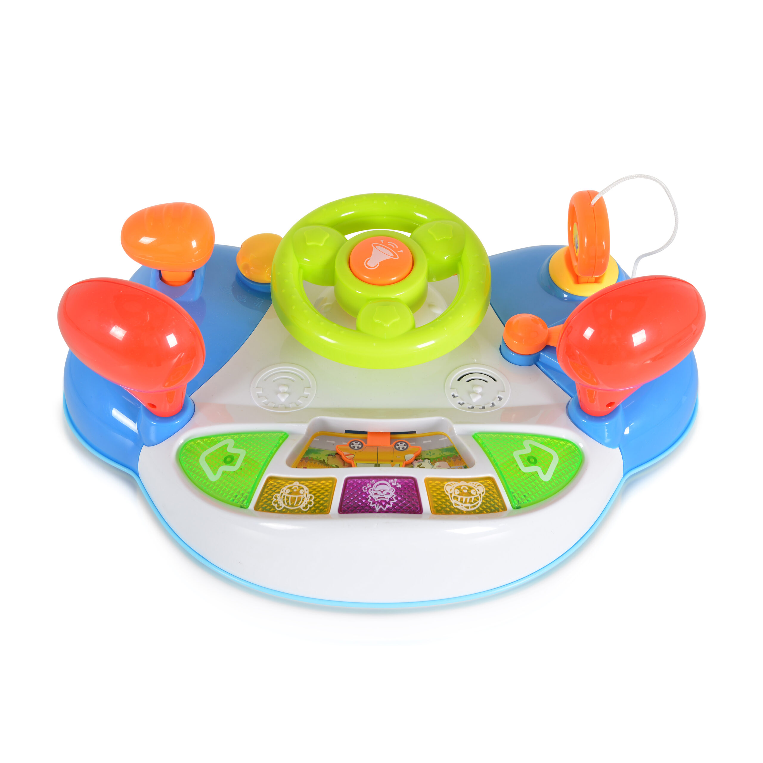 Играчката е с волан, клаксон, лост за напред, пиано бутони за различни мелодии.
