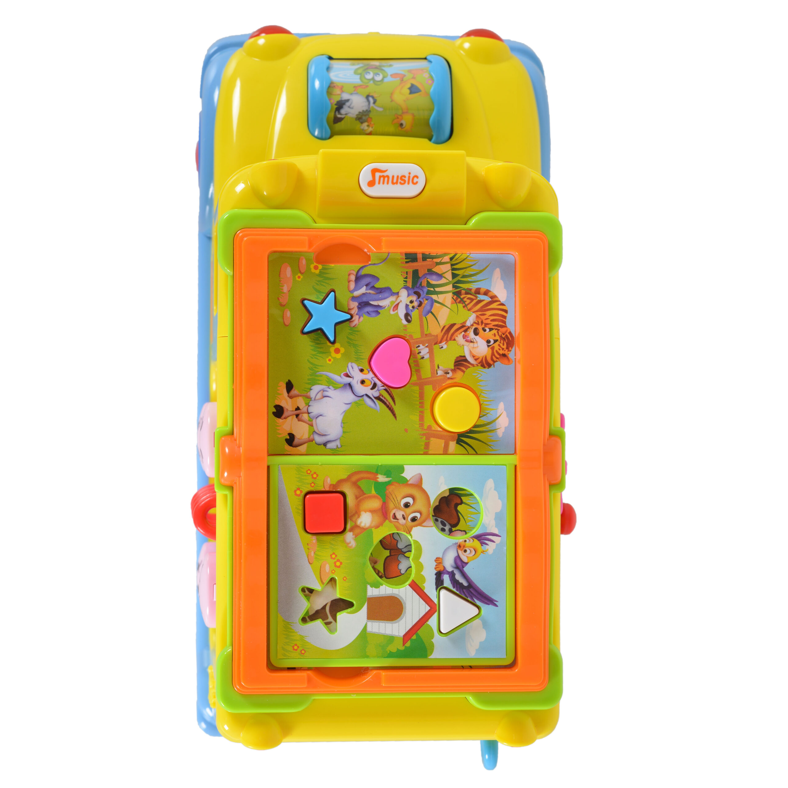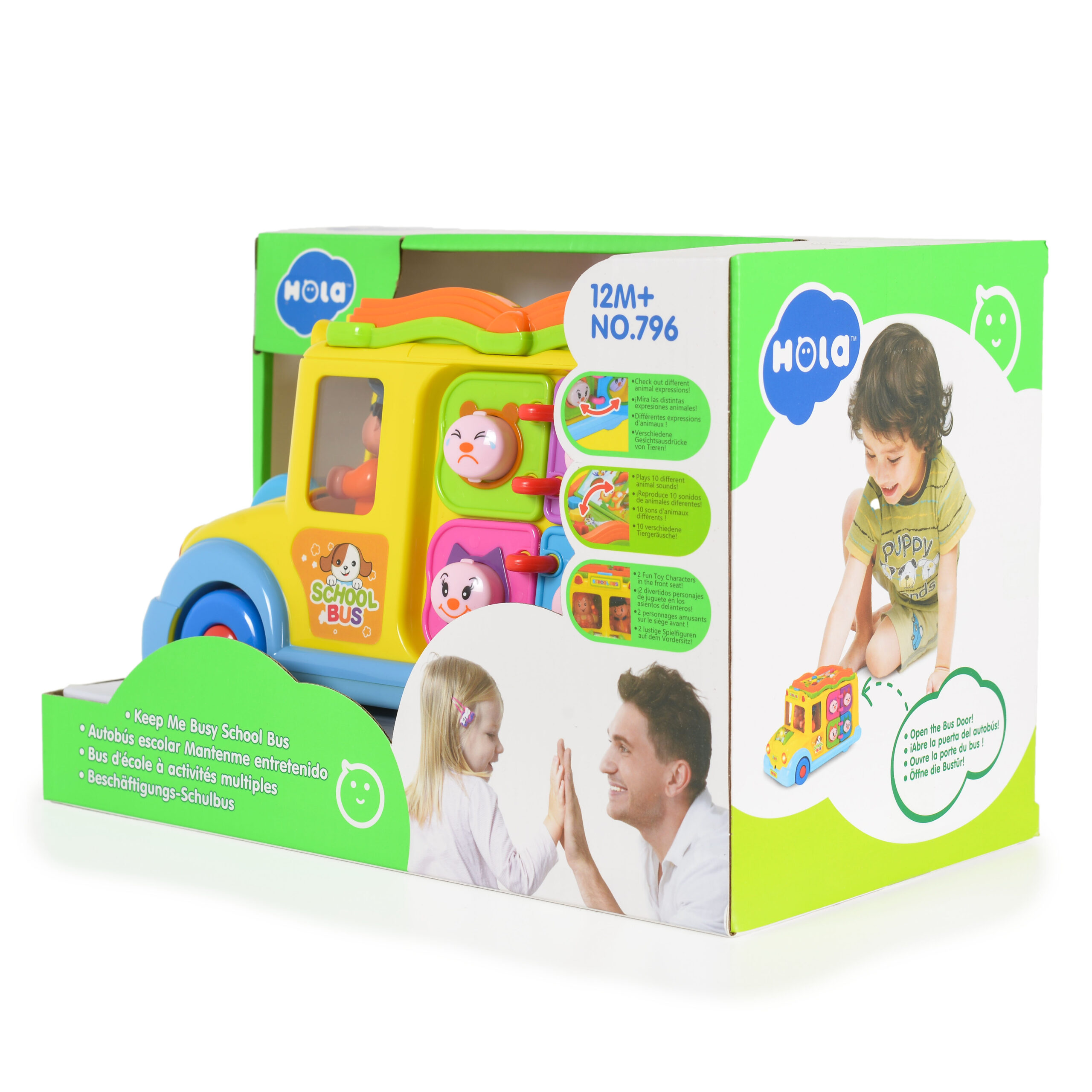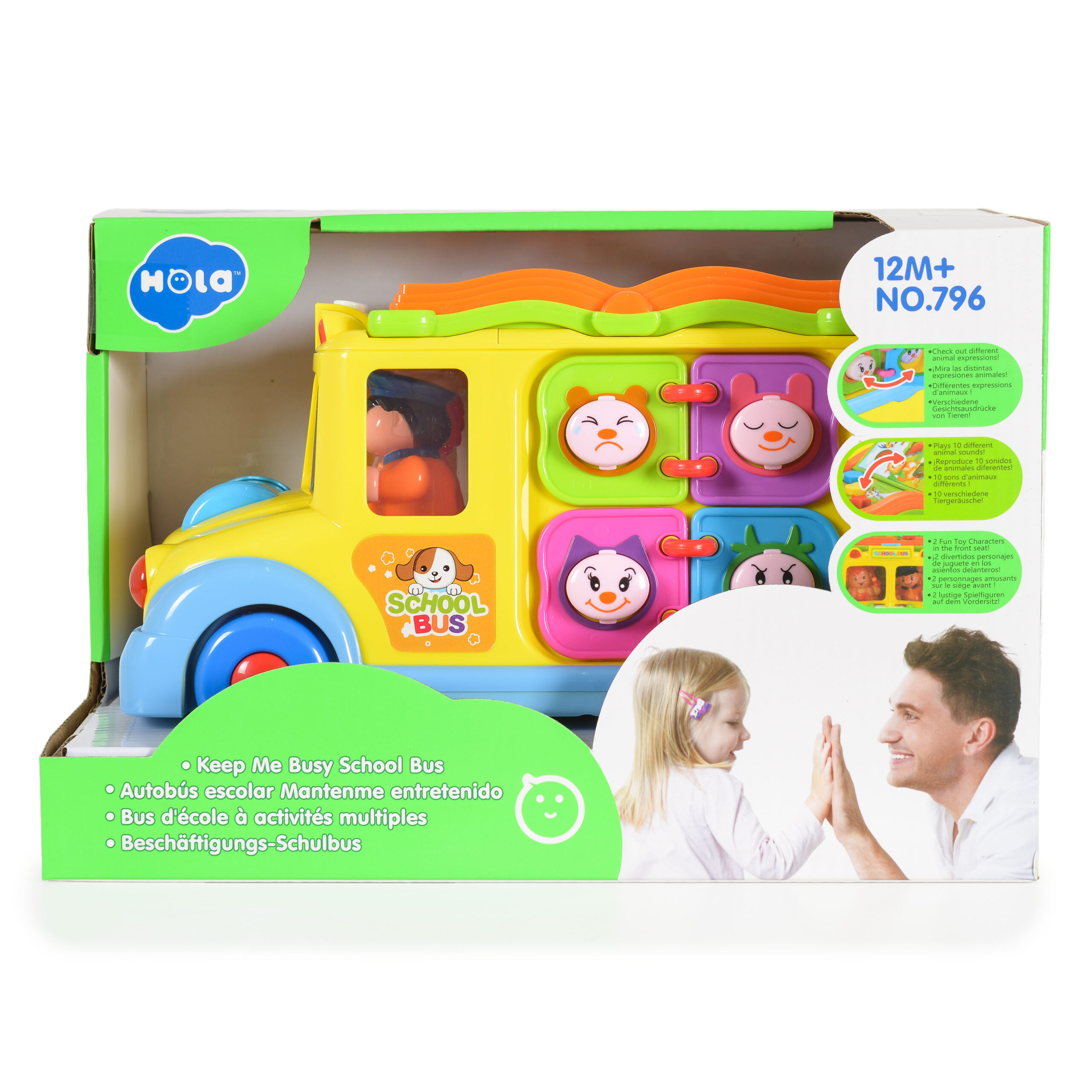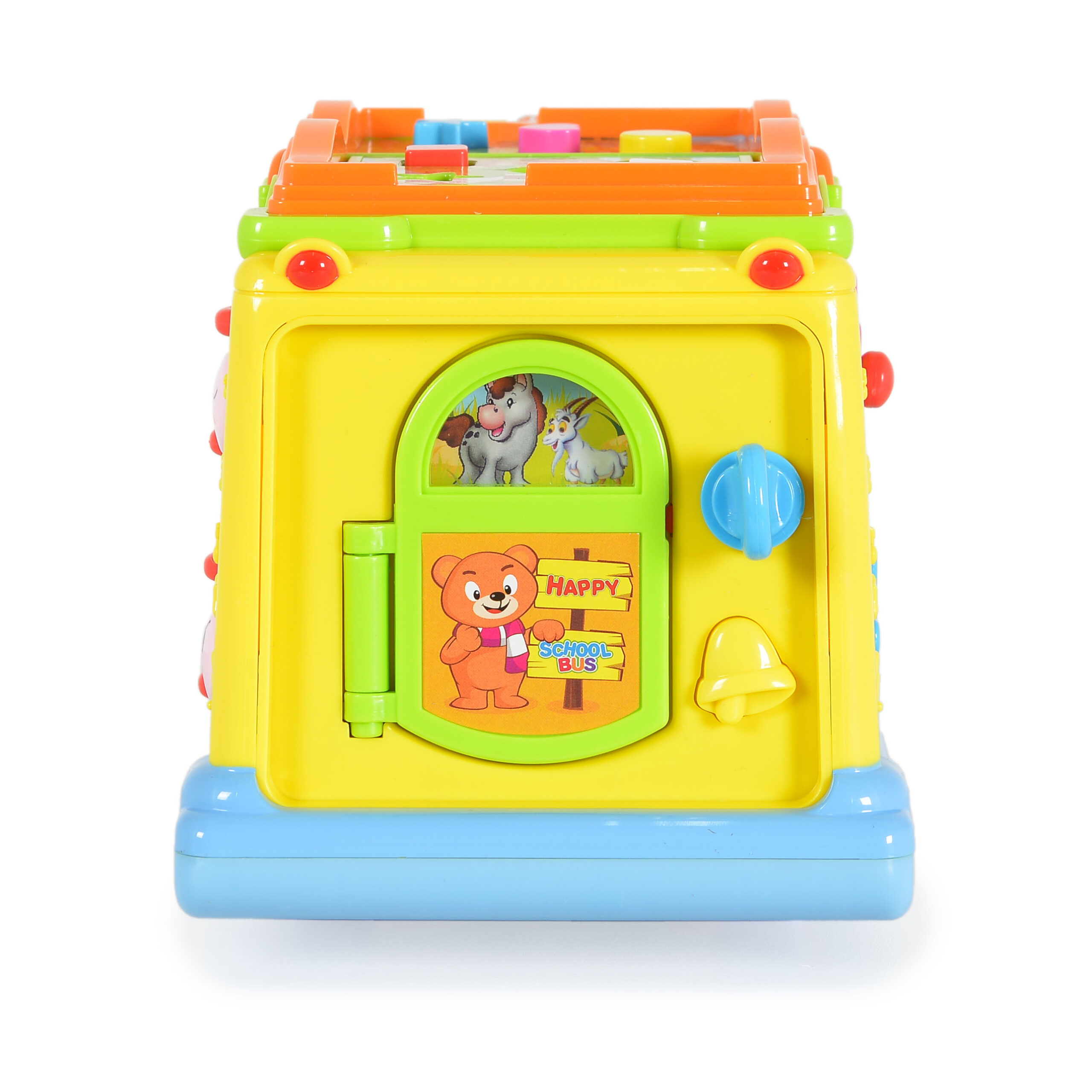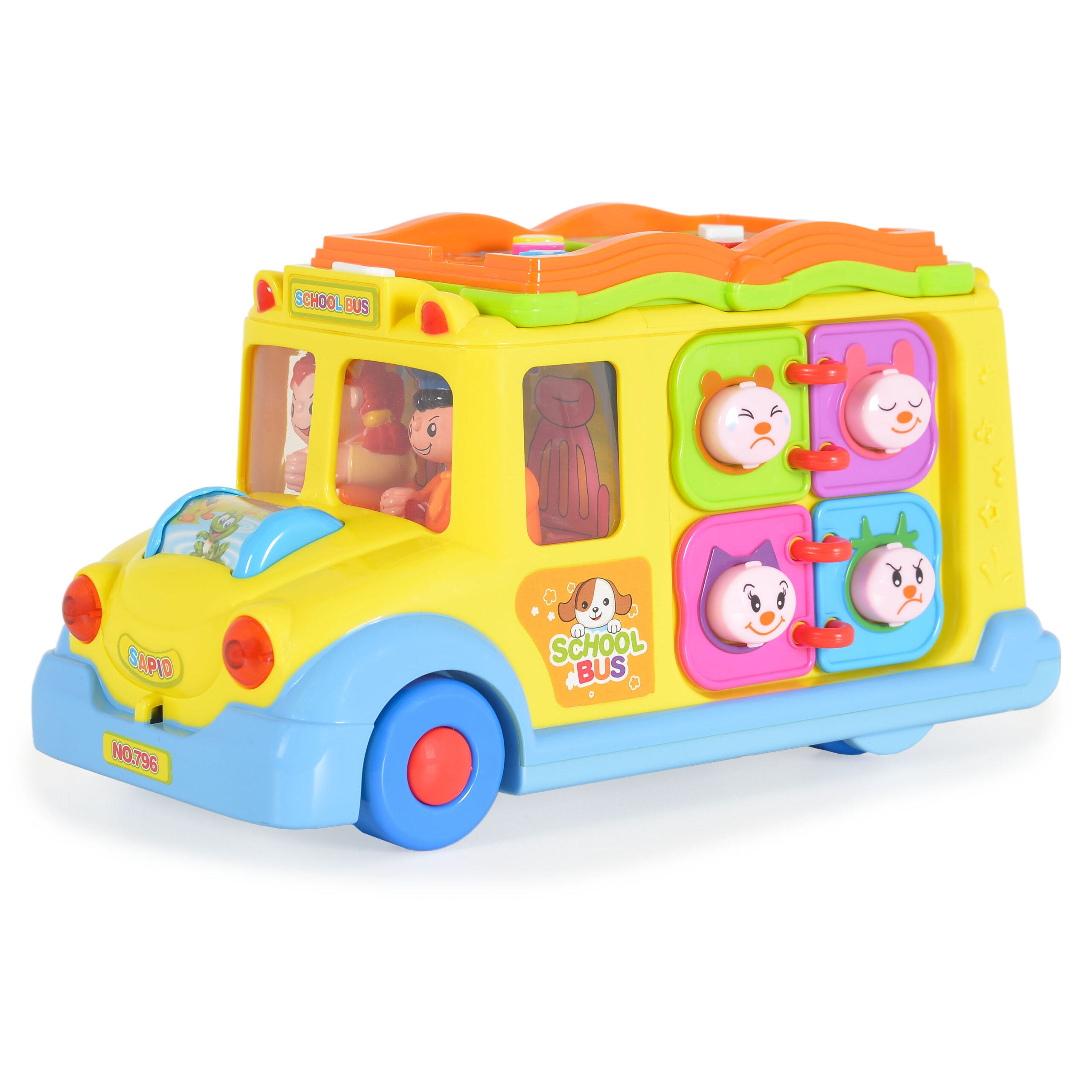 Хубавата изработка и наситените цветове на автобуса привличат вниманието на децата. Играчката със сигурност ще заинтересува и най-претенциозното дете. Автобусът се движи сам и променя посоката си, когато срещне препятствие. По време на шофиране предните му светлини мигат, а шофьорът и пътникът танцуват в ритъма на музиката. Отпред има ролка с животни, която при търкаляне започва да свети, да свири различни мелодии и да издава звуци на смеещо се бебе. На покрива на автобуса има малка книжка. На всяка страница от книжката има бутони в различни цветове и форми.При натискане ще чуете звуците на животните. След като завъртим ключа, чуваме забавен звук, вратата се отваря и винаги показва различна сцена.