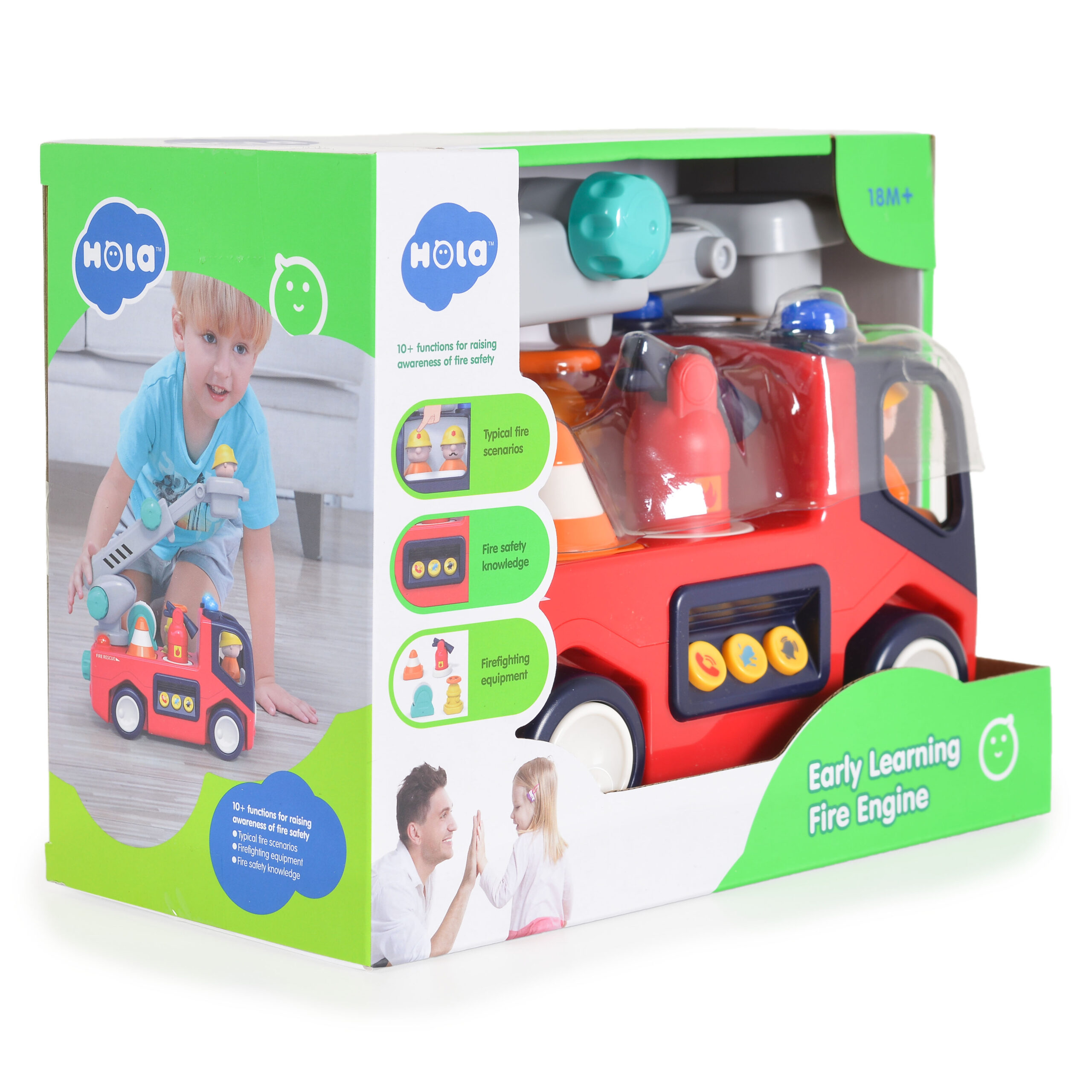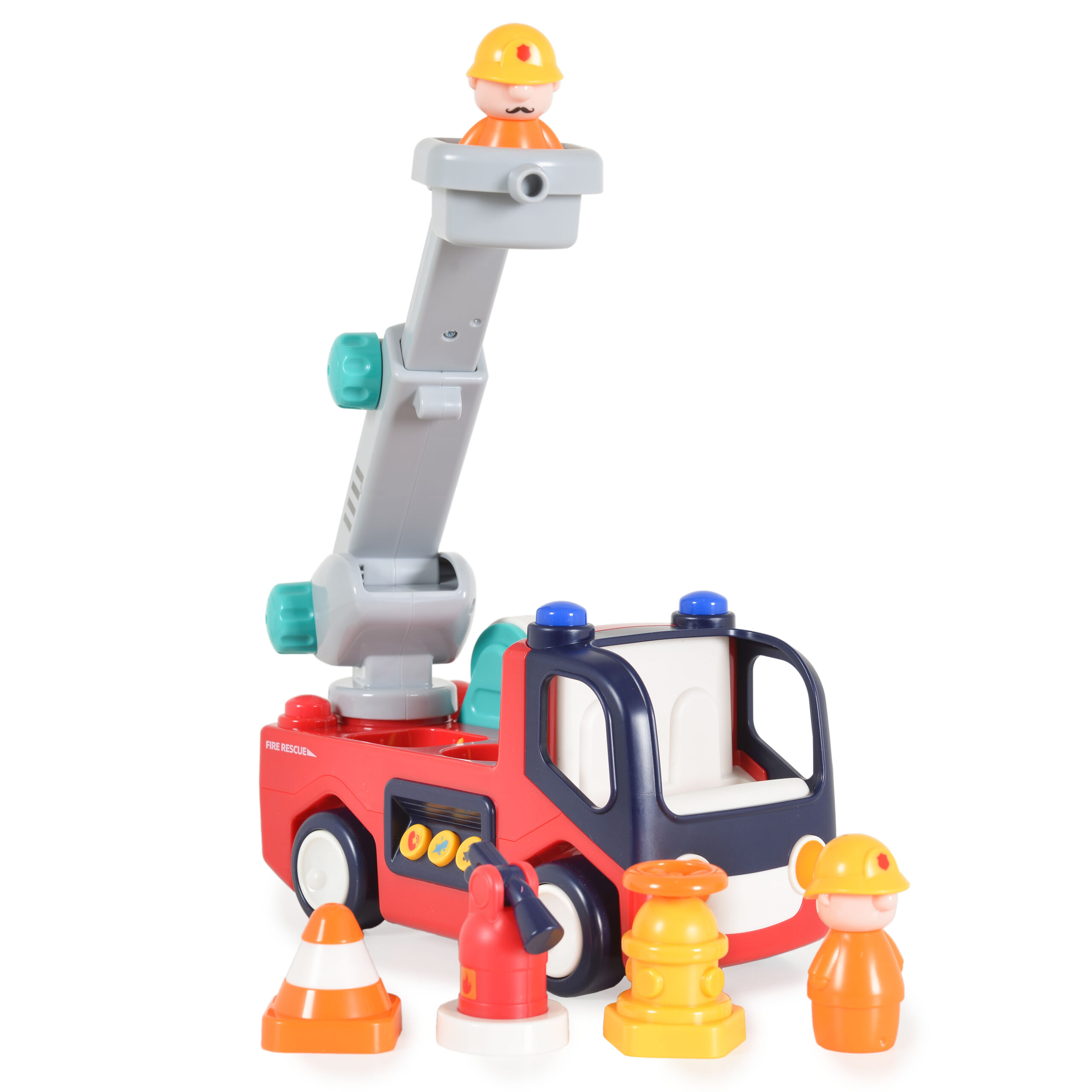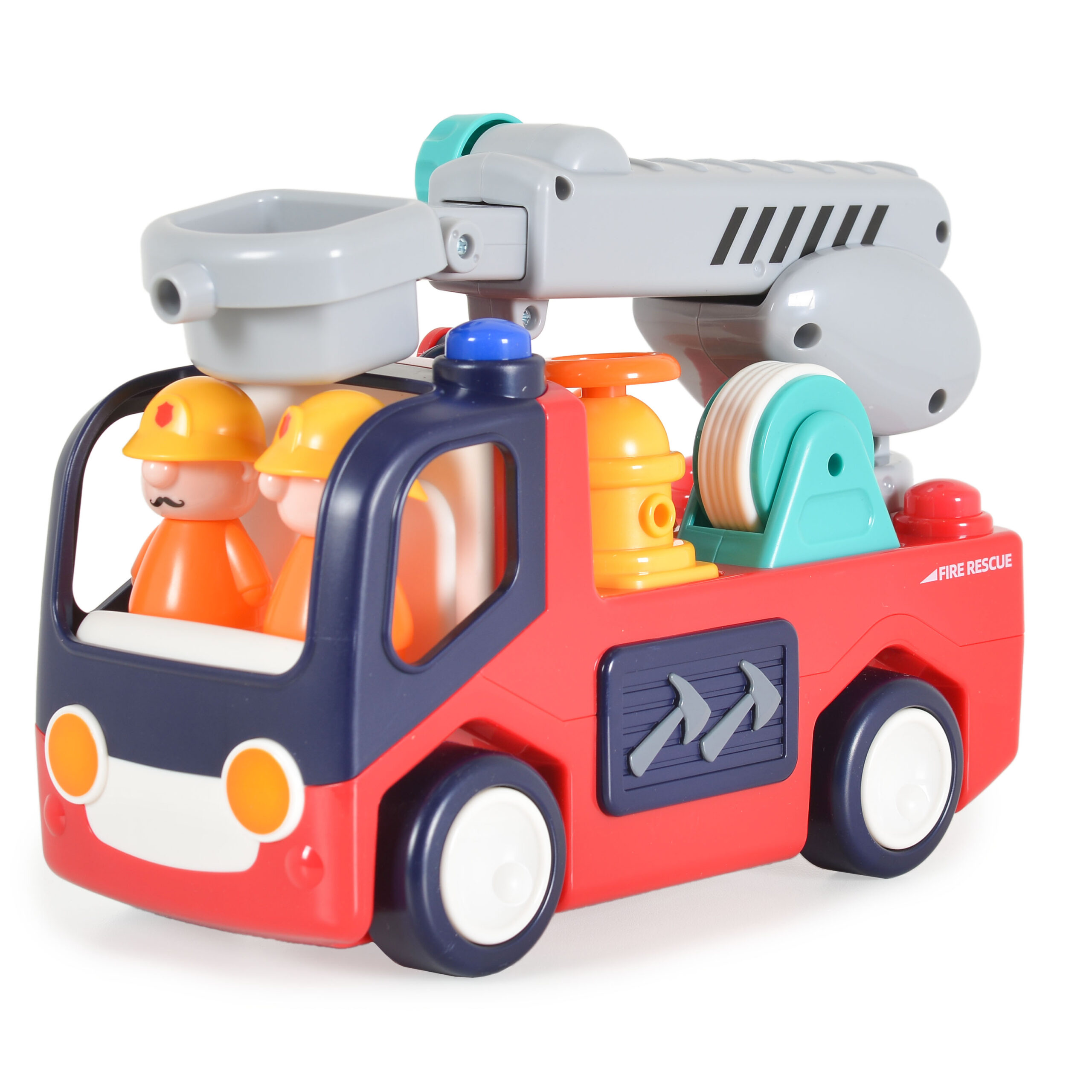 Пожарната кола с фигурки и пожарникарско оборудване е вълнуваща играчка за деца, която не само вдъхновява и забавлението, но и учи децата на важната роля на пожарникарите и безопасността. Има звук и светлини. Насърчава въображението и креативността на децата, като им помага да създават различни истории и сцени. Обучава за ролята на пожарникарите и основните принципи на безопасност. Насърчава споделената игра и комуникация, тъй като децата могат да се обединят, за да спасят измислен град от пожар.