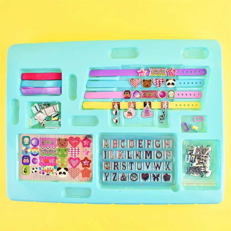 Създавайте гривни по ваш вкус с комплекта на Robetoy! Сетът съдържа всички необходими елементи за направата на уникални бижута: стикери, цветни ленти, основи за гривни и талисмани за украса. Поставете желаните висулки на верижката, допълнете със стикери и вашата гривна е готова! Комплектът ще развие творческото мислене и въображението на детето, докато то експериментира и създава красиви украшения. Разнообразието от декорации и аксесоари ще впечатли всяко малко момиченце, което има свой собствен стил. Сетът е идеален подарък и ще създаде много усмивки и незабравими моменти в процеса на изработка на цветни модели!