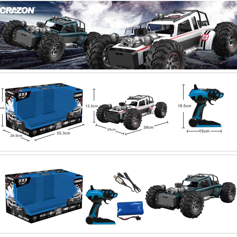 Впусни се в лудите надпревари със състезателен джип 4 х 4 от Crazon! В страхотен син цвят той се забелязва отдалеч. Благодарение на здравото си и стабилно окачване, джипът преодолява всякакви препятствия и неравни терени. Мащабът му е 1:10, което го прави изключително реалистичен и дава усещането за истинско състезание. Офроуд джипът притежава бързи висококачествени колела, които изпълняват всякакви сложни маневри, а с включения димен ефект ще впечатлиш всички, където и да си. Той ще създаде зрелищно и вълнуващо приключение, за да караш с увереност и самочувствие. Състезателният джип на Crazon се управлява с дистанционно, което допринася за скоростно изживяване и изгражда качества у детето като координация, съсредоточаване и пространствена ориентация. Скоростта, която развива автомобилът е до 20 км/ч, което го прави изключително бърз срещу другите състезатели. Управлявай и се забавлявай с невероятния син джип от Crazon!