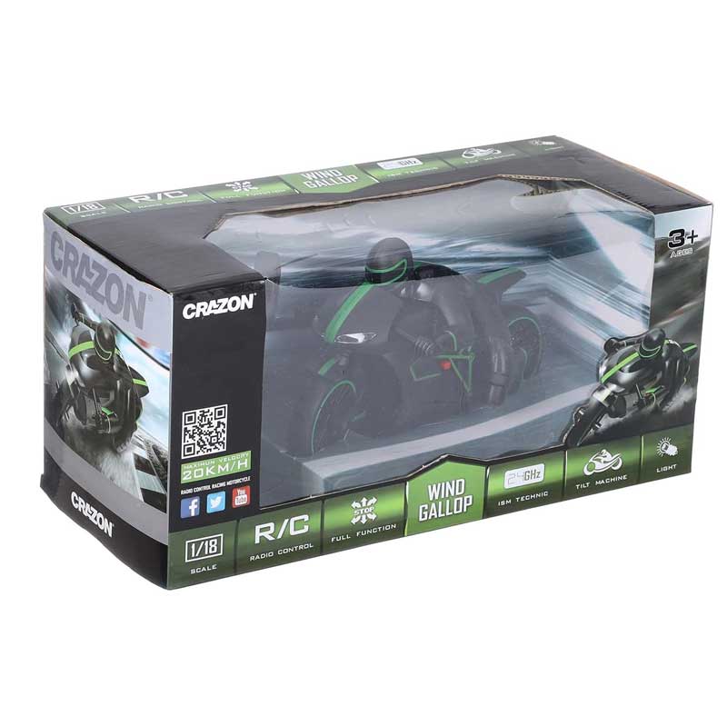 Покори всеки опасен терен и изпробвай всички функции на екстремния модел. Той се движи – напред, назад и завива наляво и дясно с 45° наклон при завоите.  Контролира се чрез дистанционно управление, а сигналът достига до впечатляващите 40-45 м. Конструкцията е здрава и стабилна, устойчива на удари, а дизайнът е изчистен и ефектен в черен цвят, със зелени детайли. Висококачествените гуми имат отлично сцепление с всеки терен, а включените LED фарове ще засенчат опонентите. Скоростта му достига до 20 км/ч., за най-бързите гонки. Моторът с безжично управление допринася за развитието на качества като наблюдателност и координация. Дрифт приключенията ще създадат забавни моменти и ще изградят умения и навици за контрола над превозното средство. Направете най-добрия подарък на вашия малък състезател с мотор от Crazon!