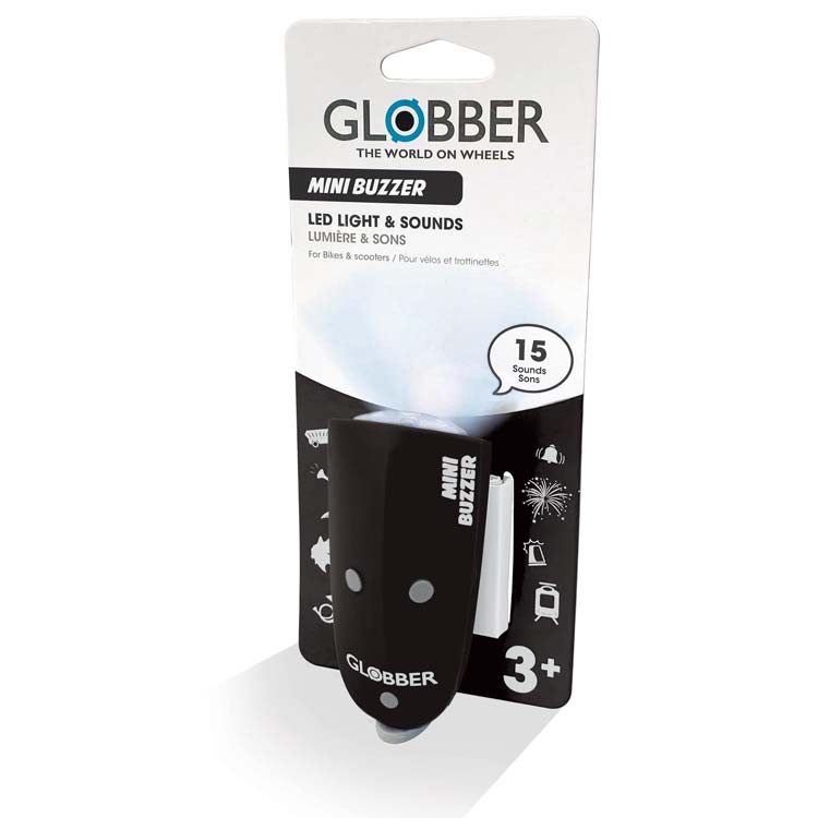 Клаксонът с LED фар за тротинетка или велосипед Mini Buzzer – 2 в 1 е произведен от Globber и с него детето ви винаги ще може да сигнализира къде се намира, както и да осветява пътя си. Уредът има 1 интегрирана светлина в бял цвят и 15 вградени забавни мелодии (звънец на колело, фойерверк, рог, свирка, пръдня, лазер, вълшебно килимче, магическо заклинание, тромпет, сирена на полицейска кола, състезателна кола, камион, влак и вълк).