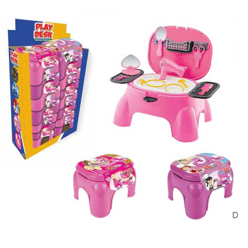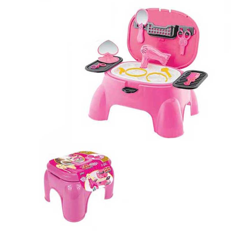 Цветното столче за игра с аксесоари за разкрасяване ще бъде чудесен подарък за всяка млада госпожица. Вашето момиченце ще може да сресва косата си, да си направи красива прическа, да украси ръцете си с гривни и пръстен. С помощта на аксесоарите в комплекта, тя може да пренесе фризьорския и козметичен салон в игрите си и да споделя миговете забавление с приятелките си. Цветното столче има удобна дръжка, за да може да се носи навсякъде. След приключване на игрите всички аксесоари могат да се приберат обратно в столчето. Играейки с него, децата развиват въображението и креативността си, като същевременно ги учи на ред, отговорност и на умението да се грижат за играчките си.