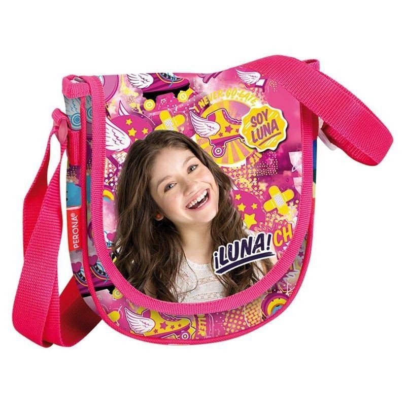 Момичешка чанта за носене през рамо с любимата на всяко дете героиня – Сой Луна. Чантата е розова на цвят с интересен цветен принт и образа на Сой Луна. Тя е с размери 17 х 18 х 4 см.
