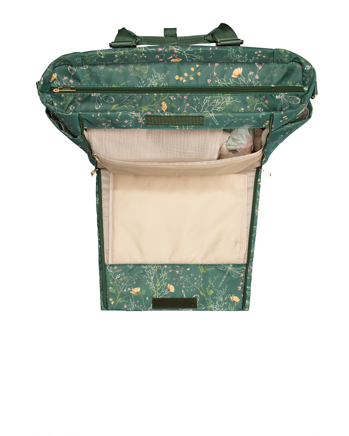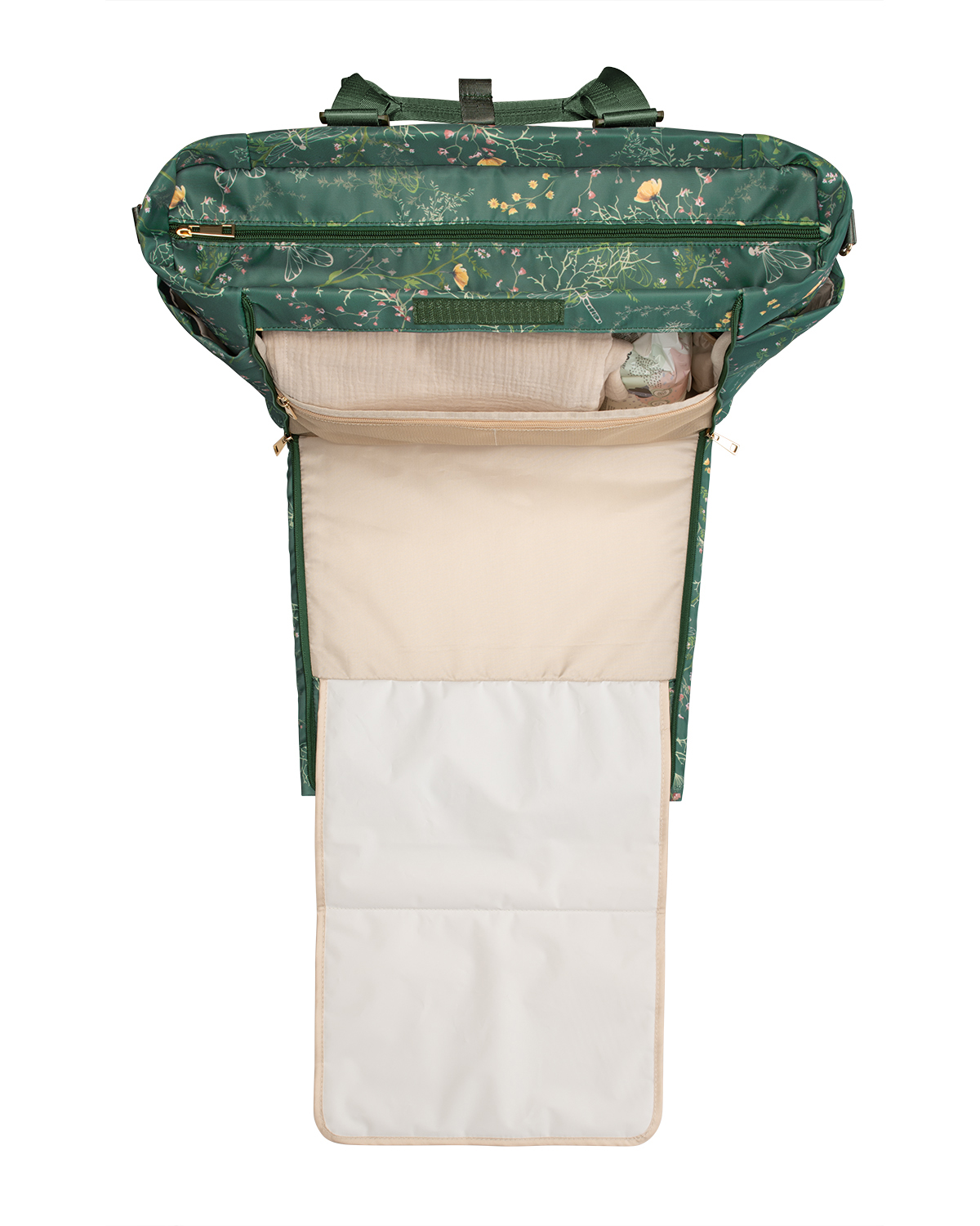 • Падаща предна страна с вградена подложка за повиване, джоб и достъп до основното отделение